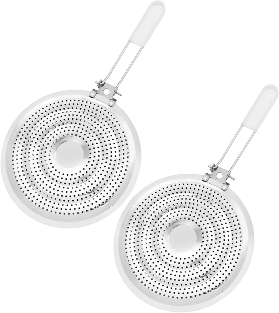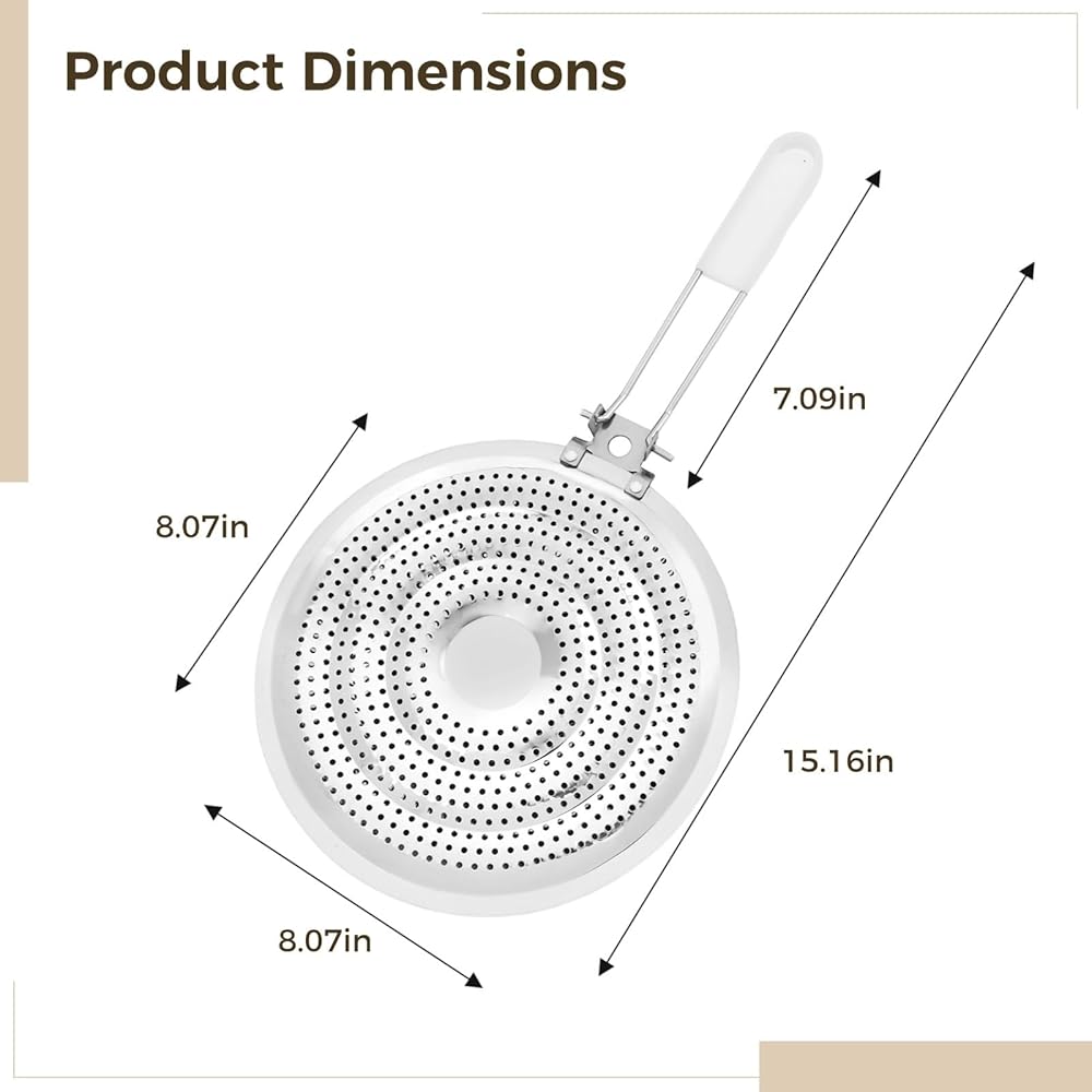 Color:white Material:stainless steel Product Size: 8.66 in x 8.66 in x 1.57 in Package Includes:heat diffuser plate x 2 Note: - Please refer to the measurement. Tiny measuring error is allowable in normal range. - There might be a little color difference due to the monitor, camera or other factors, please refer to the physical item.