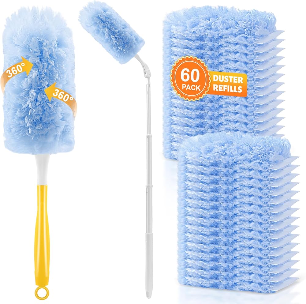عبوة من 60 قطعة من منفضة الغبار شديدة التحمل متوافقة مع سويفر، مقبض قابل للتمديد بطول 3 أقدام، منفضة غبار من الألياف الدقيقة متعددة الأسطح 5X للمنزل والمراوح والستائر وفتحات التهوية وتنظيف السيارة