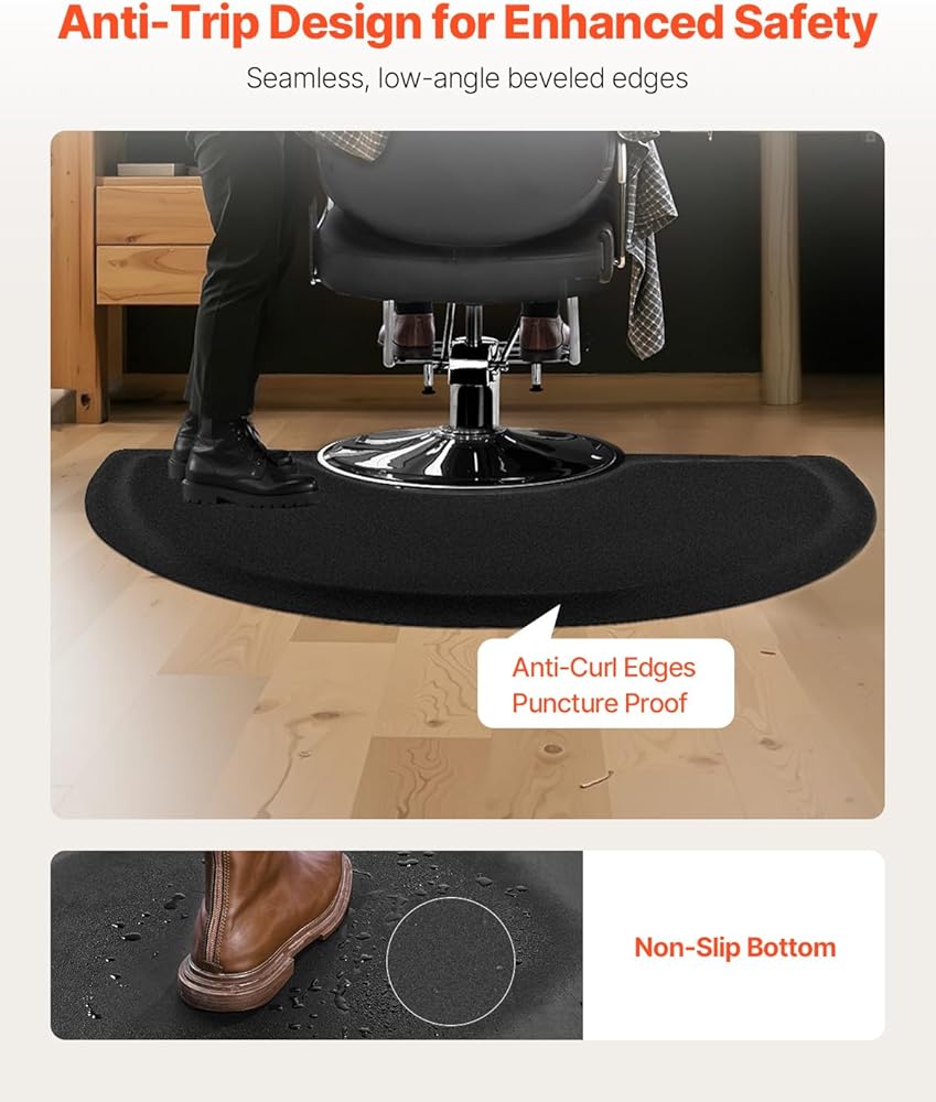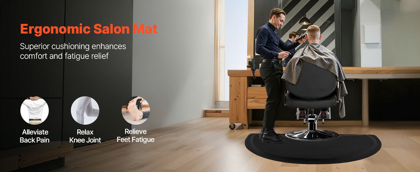 • Practical & Stylish: VEVOR salon mat for hairstylist helps relieve backaches, ankle fatigue and knees tension, while promoting healthier standing posture. Plus, its sleek matte black finish adds a modern touch to elevate the salon's overall aesthetic