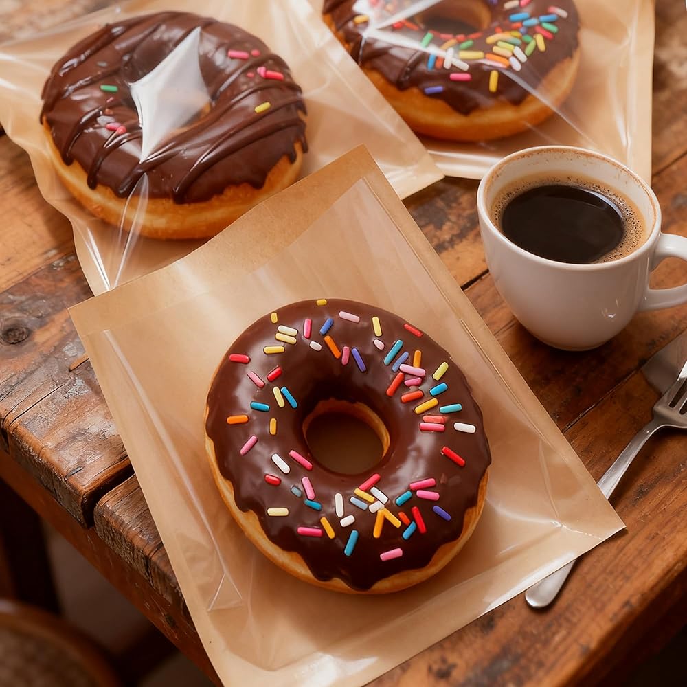 Material - These small donut bags are made from kraft paper and PET plastic, and the transparent window perfectly displays your delicate desserts. The inside of the cookie bag is covered with a film that makes it store baked goods without worrying about oil penetration (note: In no case, shall this kind of paper be in the microwave oven)