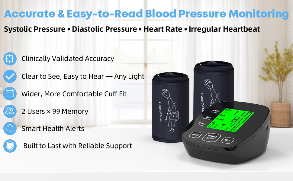 الدقة والموثوقية: تم التحقق من صحتها سريريًا واختبارها بدقة للحصول على قراءات مستقرة ودقيقة لضغط الدم تلبي معايير الشهادات الاحترافية. ما عليك سوى الضغط على زر START/STOP، ويتم نفخ الكفة تلقائيًا لإظهار قيم الضغط الانقباضي والانبساطي والنبض بوضوح من أجل مراقبة صحية موثوقة في المنزل.