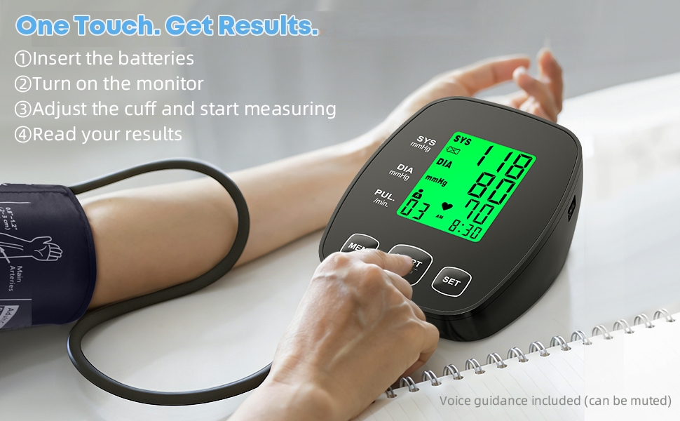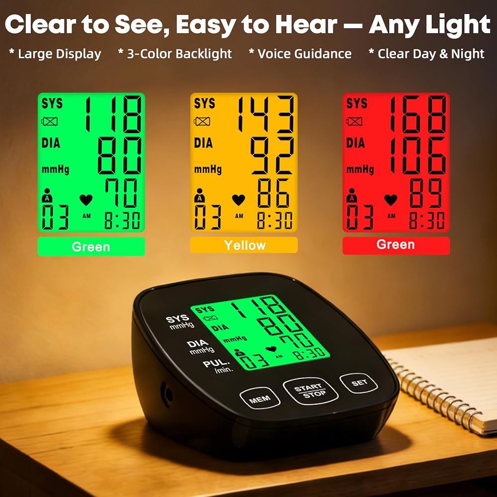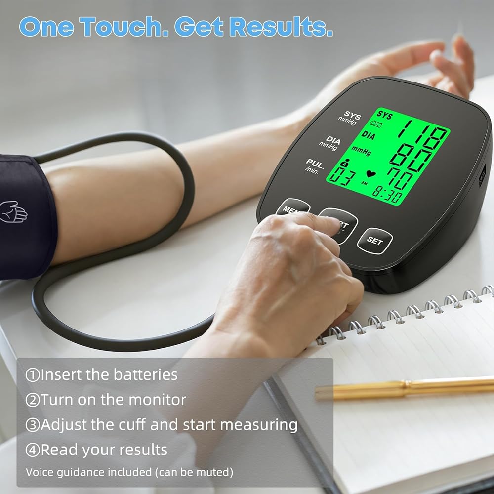 سهل الاستخدام وتصميم مناسب لكبار السن: تشغيل بزر واحد مع النفخ والقياس التلقائي. يتضمن التوجيه الصوتي (يمكن كتمه إذا كان ذلك مفضلاً). تساعدك الإضاءة الخلفية ثلاثية الألوان على فهم مستوى ضغط الدم لديك بسهولة: طبيعي أو مرتفع أو مرتفع.