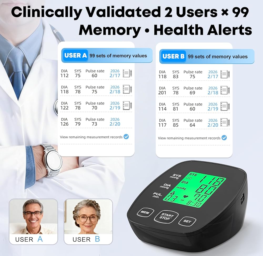 2 × 99 تنبيه للذاكرة والصحة: يخزن ما يصل إلى 99 قراءة لكل مستخدم، مما يجعل من السهل تتبع ضغط الدم بمرور الوقت. مؤشر عدم انتظام ضربات القلب ينبهك أثناء القياس لتوعية صحية أفضل.