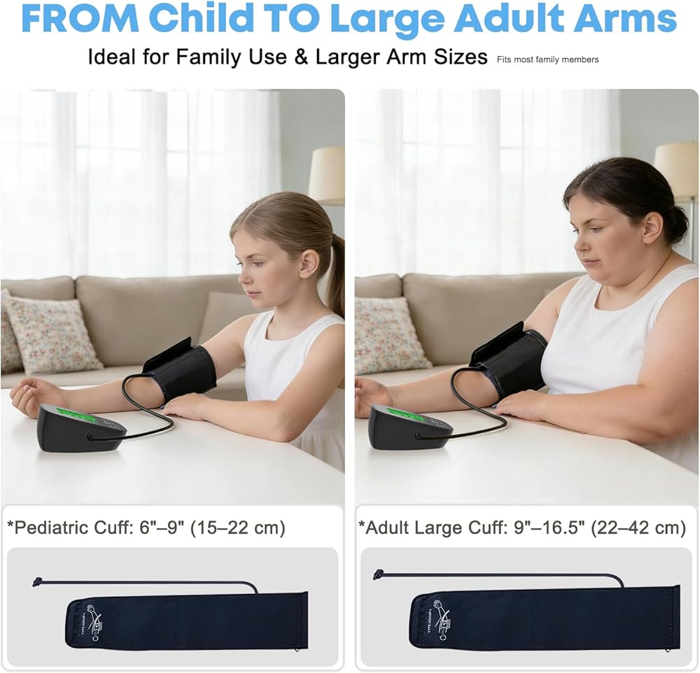 ملاءمة مريحة لمختلف أحجام الأذرع: يأتي مع اثنين من أساور ضغط الدم: سوار للأطفال (6"-9" / 15-22 سم) وسوار كبير للبالغين (9"-16.5" / 22-42 سم)، مما يوفر نطاقًا مناسبًا بالكامل لجميع أفراد الأسرة. مثالي للأطفال والمراهقين وكبار السن والبالغين ذوي الأذرع الكبيرة. الكفة مريحة وتظل ثابتة في مكانها أثناء القياس.