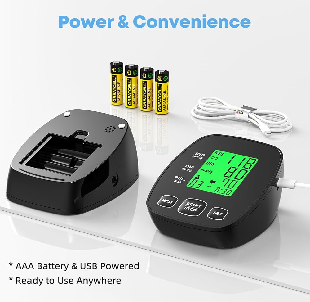 جهاز مراقبة ضغط الدم للاستخدام المنزلي، أساور واسعة النطاق للذراع العلوي تناسب الأطفال والبالغين الكبار، سهلة الاستخدام، قراءات انقباضية دقيقة للضغط الانقباضي، تتضمن كابل USB و4 بطاريات AAA