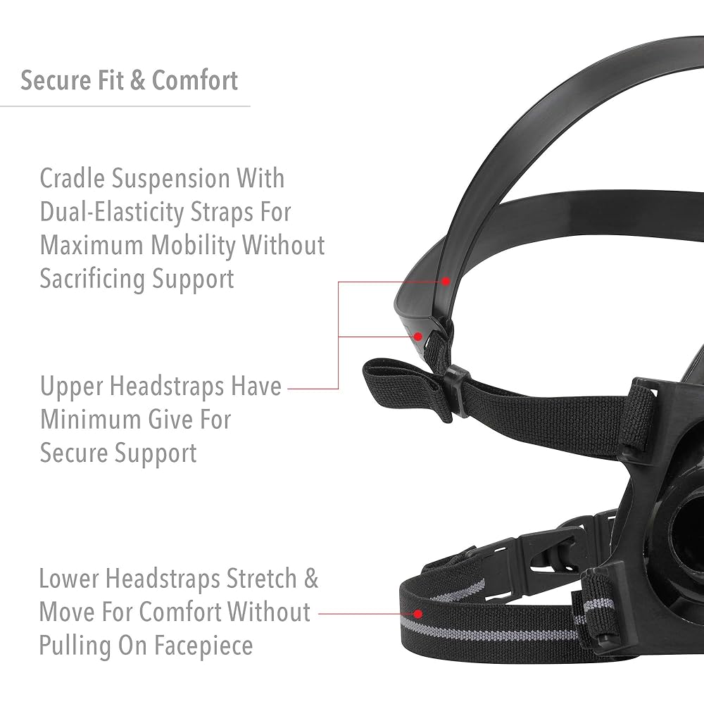 SECURE FIT: Contoured face seal with variable thickness for optimal seal in all facial areas; fits most face shapes & sizes; cradle suspension with dual-elasticity straps maximizes mobility; threaded cartridge connectors prevent accidental disconnection