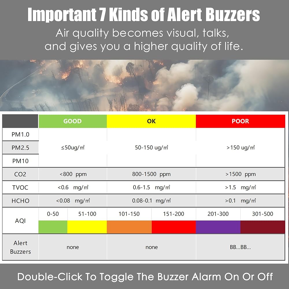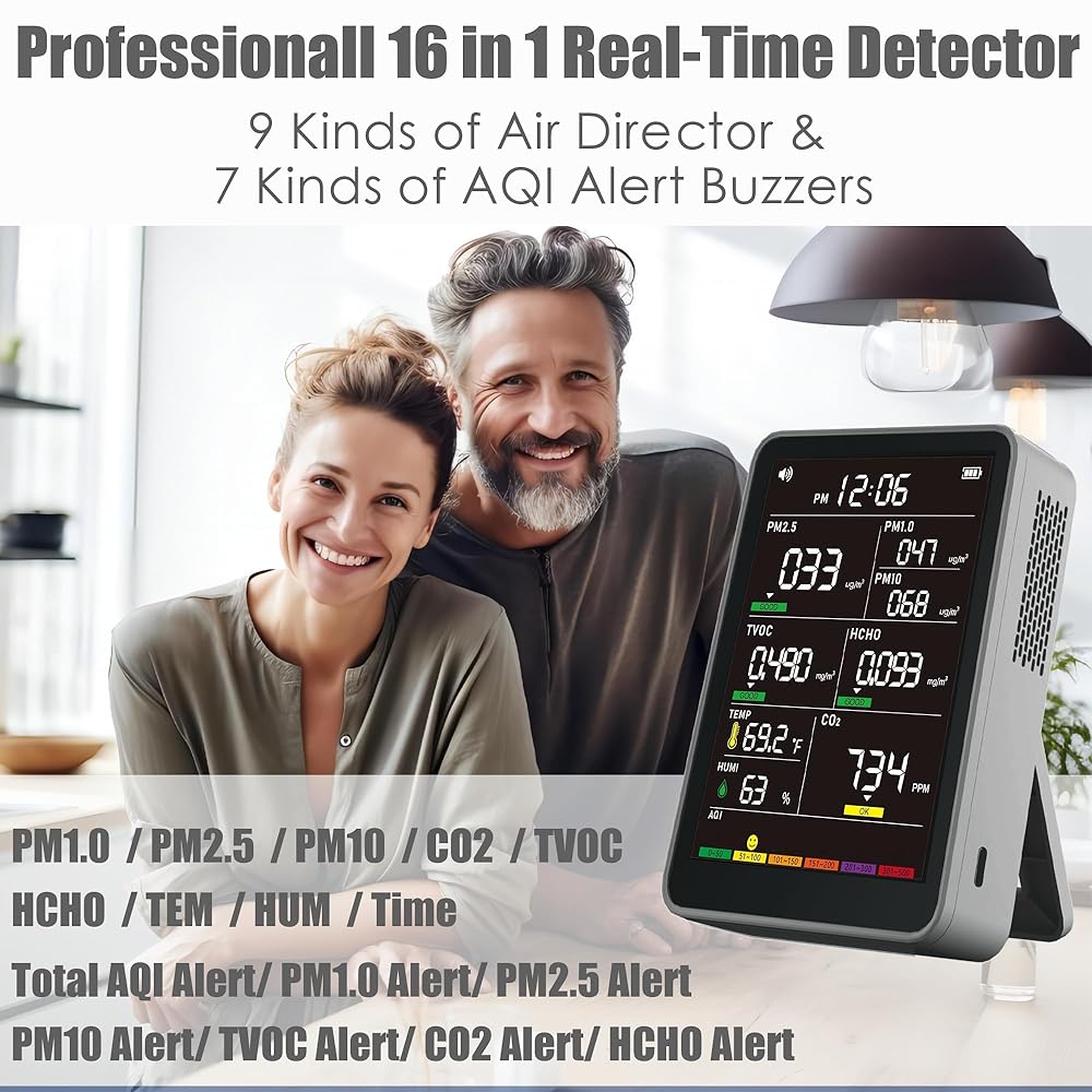 【Professional 16-in-1 Real-time Air Quality Monitor】: With real-time detection of PM1.0 | PM2.5 | PM10 | CO2 | TVOC | HCHO | TEM | HUM, plus 7 types of AQI alert and buzzer functions, this monitor ensures you always know what's in the air around you.