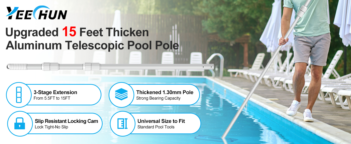 【عمود مقشدة حمام السباحة يتسع حتى 15 قدمًا - قضيب قفل مقاوم للانزلاق 】3 قطع عمود سميك مع 2 قضيب قفل مقاوم للانزلاق ورأس مطاطي مخطط مع تصميم حلقة رفع - يجعل من السهل قفل طول العمود في مكانه والحفاظ على الطول في مكانه دون انزلاقه أثناء الاستخدام. يمتد الطول من 5.5 قدم إلى 15 قدم، مما يوفر لك الوصول الإضافي المطلوب عند تنظيف حمام سباحة واسع وعميق. عمود حمام سباحة مثالي للاستخدام اليومي لتنظيف حمامات السباحة بسرعة وسهولة وفعالية.