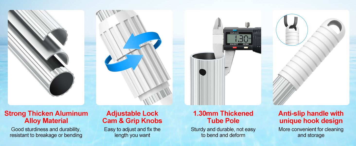 【عمود حمام سباحة سميك 1.30 مم 】عمود تنظيف حمام السباحة مصنوع من الألومنيوم المؤكسد بدرجة تجارية بسمك 1.30 مم بلمسة نهائية فضية ناعمة، ليس من السهل الانحناء والتشوه حتى إذا تم استخدامه لفترة طويلة، قدرة تحمل قوية، هيكل صلب، قوي ومتين. ملاحظة: إذا كنت تريد شراء مجموعة تنظيف حمام السباحة، فيرجى البحث عن ASIN أدناه[B0CZQNLF2K][B0CZQQMHJF]