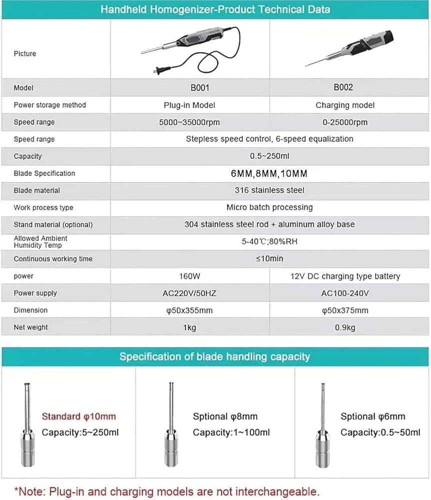 The portable micro-homogenizer is an innovative, high-speed device perfect for laboratory applications. This versatile handheld tool excels in homogenizing, micro-dispersing, and emulsifying both animal and plant tissues, making it an essential addition to your lab equipment. With its user-friendly digital display, this micro-homogenizer is suitable for various tasks, including formulation in paints, cosmetics, and other emulsifying processes. Key liquid handling capacities include: - 10mm head: 0.5-250ml - 6mm head: 0.5-50ml - 8mm head: 1-100ml Specifications: - Product Name: High-speed homogenizer - Speed Range: 5000-35000rpm (B001 model), 0-25000rpm (B002 model) - Speed Control: Stepless speed regulation with 6 adjustable options - Head Sizes: 10mm, 8mm, 6mm - Head Material: 316 stainless steel for durability - Ideal for: Micro-batch processing - Operating Conditions: Ambient temperature of 5-40°C; humidity up to 80% RH - Continuous Use: Up to 10 minutes - Power: 160W (B001 model), 12V DC rechargeable lithium battery (B002 model) - Power Supply: AC220V/50Hz (B001 model); AC100-240V (B002 model) - Dimensions: 50×355mm (B001), 50×375mm (B002) - Weight: 1kg (B001), 0.9kg (B002) Included in the package: - 1 High-speed homogenizer - 1 Power adapter (B002 model) - 3 Blade heads for versatility - 1 Instruction manual for easy operation Please note: The B001 model requires a 220V power supply, while the B002 model operates on a convenient 12V DC rechargeable lithium battery. Elevate your lab's performance and efficiency with this high-speed homogenizer, designed to meet the demands of modern research and production tasks.