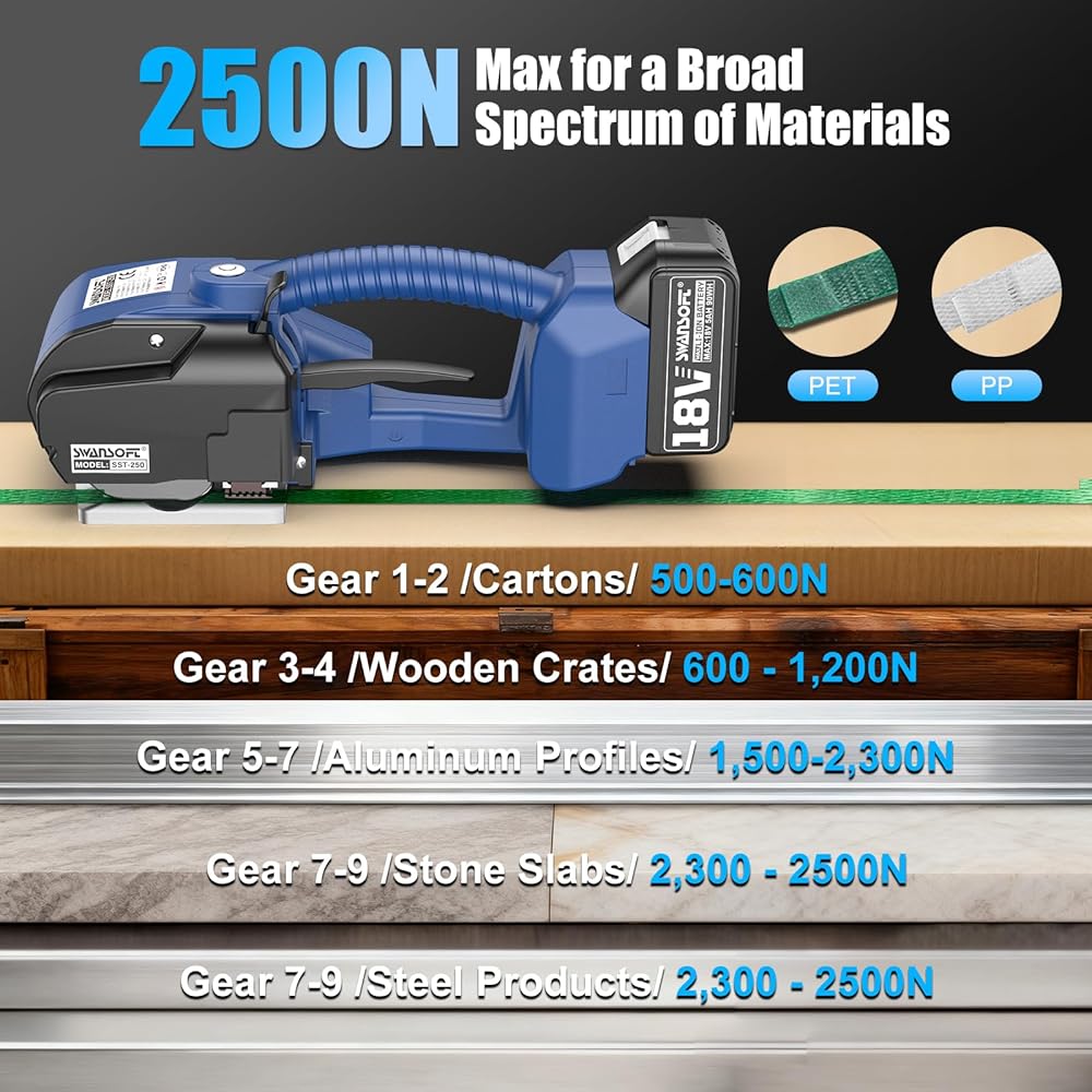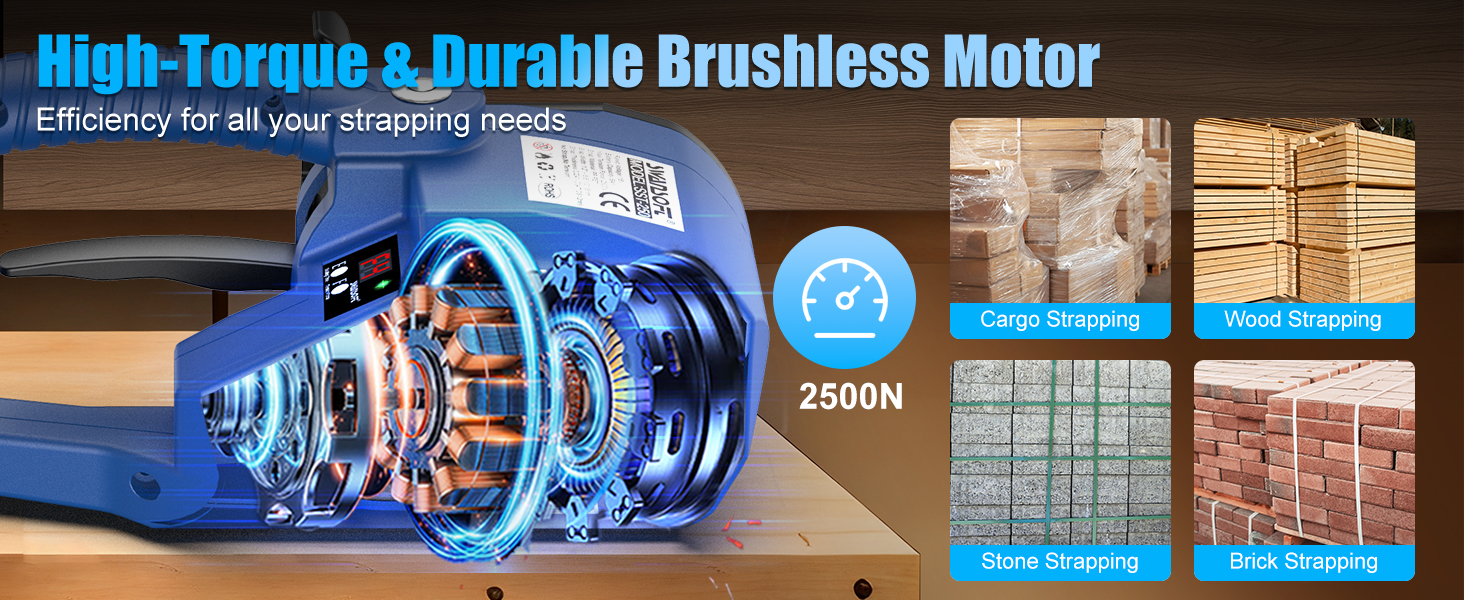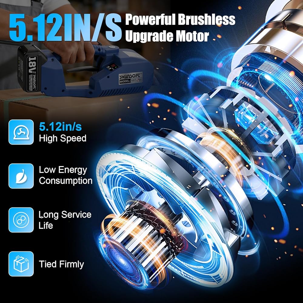 High-Performance Brushless Motor: This banding tools for strapping delivers a fast strapping speed of 5.12 in/s and a powerful maximum tension of 2500 N. It features 9 adjustable tension settings for precise adaptation to various package types. Engineered for high-demand, high-volume operations, it ensures consistent high-power output, extended service life, and significantly reduced maintenance.