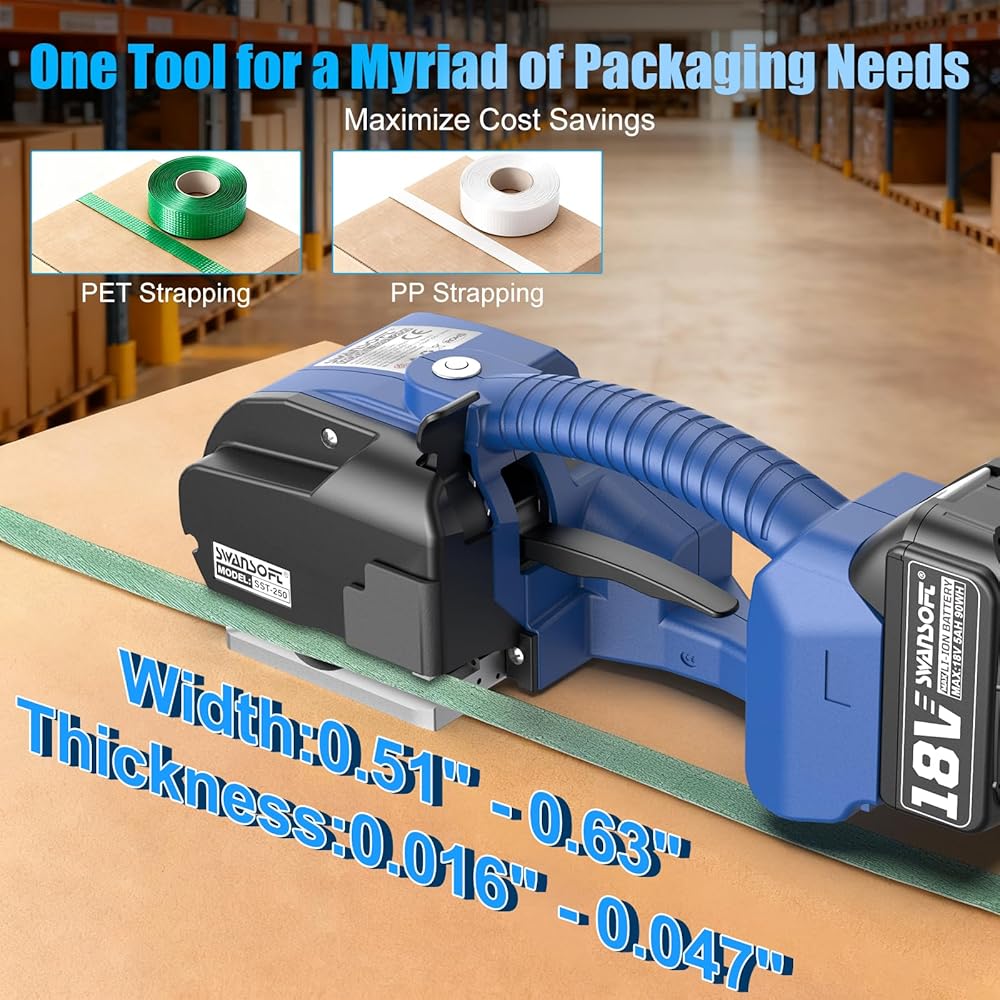 For PP and PET Strapping: This electric strapping machine is designed for versatility, compatible with both PP and PET straps ranging from 0.51" to 0.63" in width and 0.016" to 0.047" in thickness. It is the ideal tool for securing shipping cartons, reinforcing moving boxes, bundling construction materials, and stabilizing palletized loads in warehouse operations.