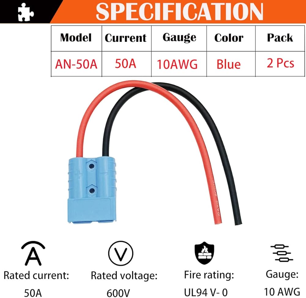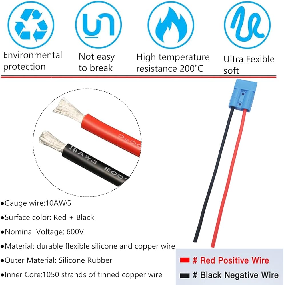 موصل بطارية CESFONJER 50A، موصل بطارية سريع التوصيل/فصل سريع 600 فولت، مع سلك سيليكون 25 سم 10AWG (مجموعتان، أزرق)