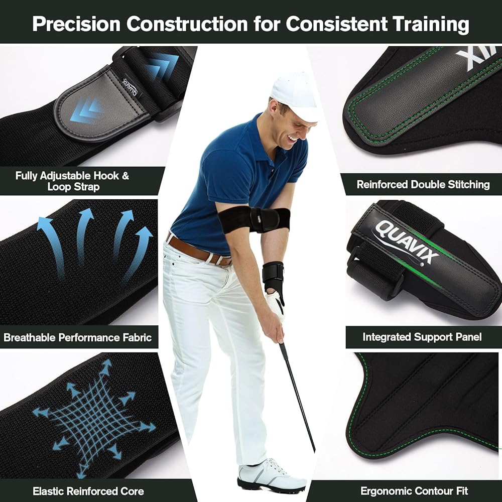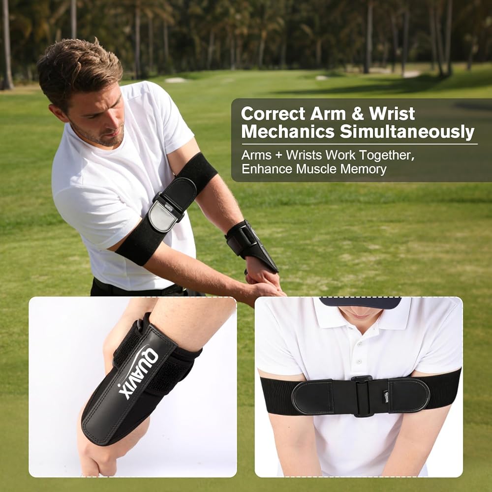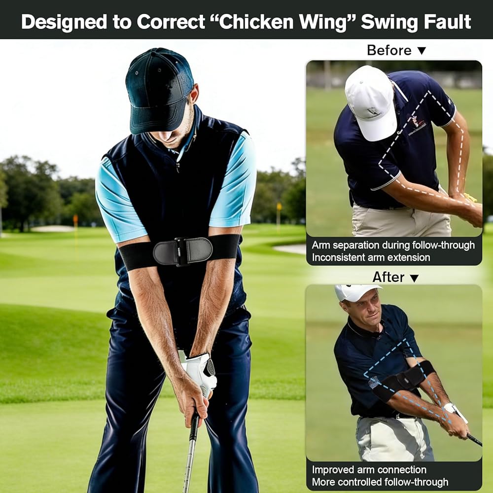 حزام الذراع لتحسين اتصال الذراع: يعزز حزام ذراع الجولف المحاذاة الصحيحة للذراع ويساعد على تقليل فصل الذراع المفرط أثناء التأرجح. إنه يشجع على حركة تأرجح أكثر ارتباطًا وإيقاع تأرجح أفضل بشكل عام.