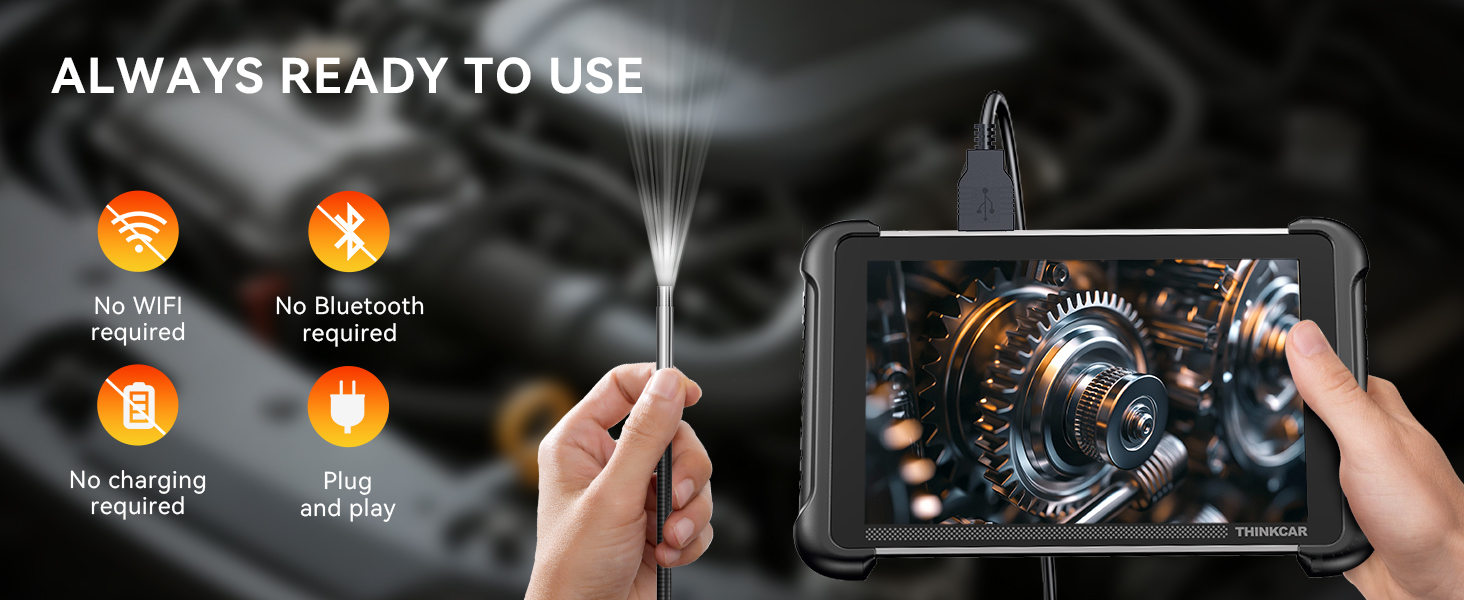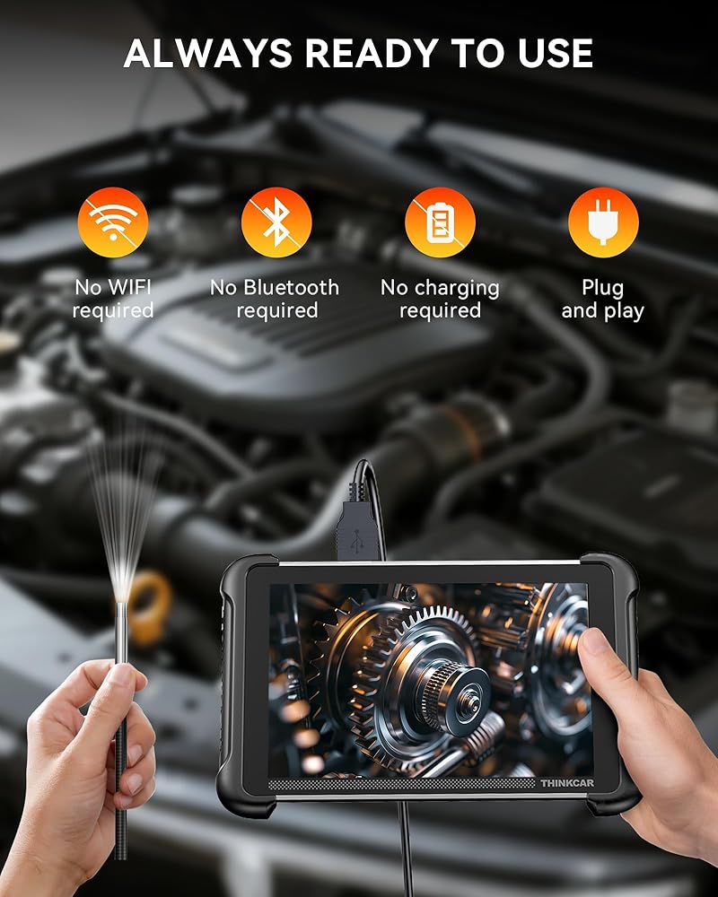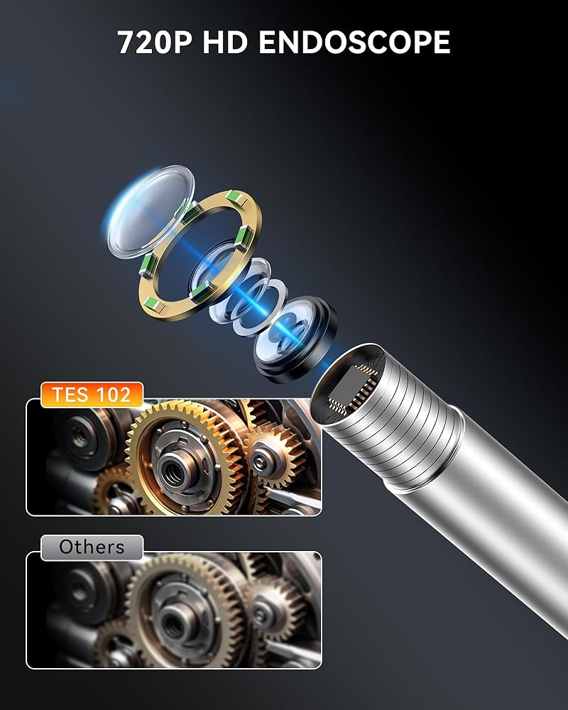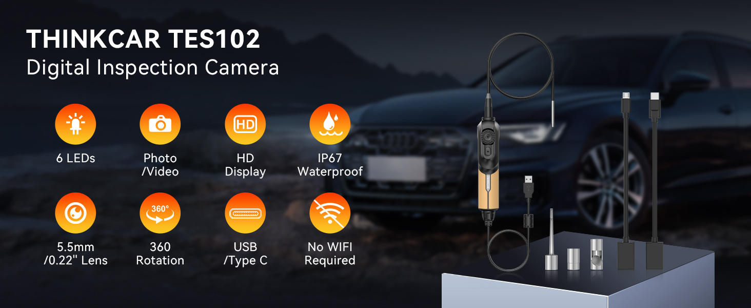 THINKCAR TES102 كاميرا المنظار مع الضوء، 0.21 بوصة HD Borescope مع 6 مصابيح LED قابلة للتعديل، IP67 كاميرا ثعبان شبه صلبة مقاومة للماء، بنقرة واحدة لقطة التفتيش Borescope
