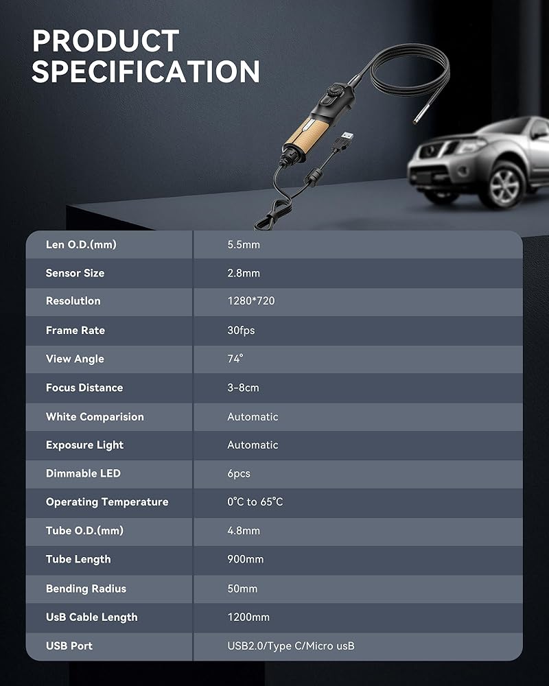 • [محتوى العبوة] كاميرا منظار Thinkcar، كابل من النوع C، كابل Micro USB، خطاف، مغناطيس، مرآة، دليل المستخدم.
