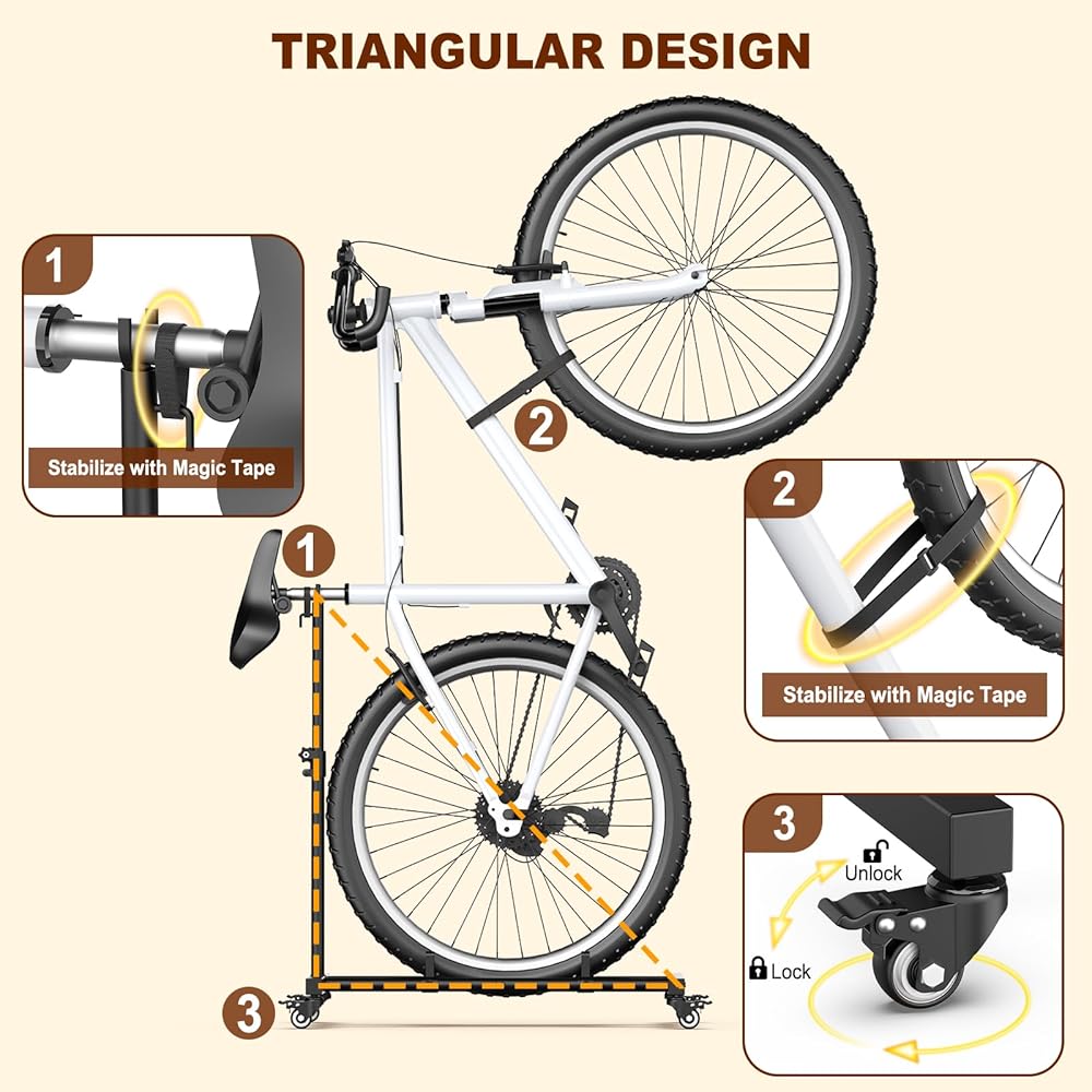 【هيكل دعم مثلثي ثابت】: تم تصميمه بدعامات معدنية معززة على شكل حرف W وحامل مقعد مبطن، يخلق حامل الدراجة هذا نظام دعم مثلثًا يمكن الاعتماد عليه. يضمن الهيكل الفولاذي المطلي بالمسحوق عالي التحمل مقاومة طويلة الأمد للصدأ، بينما تعمل أشرطة الفيلكرو القابلة للتعديل على ربط العجلة الأمامية وعمود المقعد بشكل آمن. يمنع هذا التصميم الانقلاب ويحافظ على ثبات دراجتك أثناء التخزين.