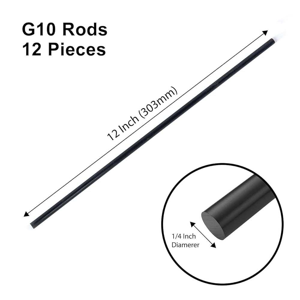 【MATERIAL】: G10 Garolite round rods in black color. High-performance, fiberglass-reinforced epoxy composite known for its exceptional strength, electrical insulation, moisture resistance, and durability in harsh environments. 【DIMENSION 】: 12 pieces of 1/4" (6mm) diameter G10 garolite round rods, 12 inch (303mm) in length. 【USAGE】: Perfect material for various industrial and DIY applcations. Ideal for crafting knife scales, tool handles, pistol grips, and other high-stress components due to its durability, lightweight nature, and resistance to wear, moisture, and chemicals. 【DETAILS】: Can be cut with a hacksaw, bandsaw, or diamond-coated cutting wheel (wear a mask to avoid fiberglass dust), then shaped with files, sandpaper, or a CNC machine; it bonds well with epoxy for handles, scales, or structural parts and can be polished to a smooth finish. 【PACKAGING 】: Bundled in a thick, durable PE plastic bag to prevent damage during storage and shipping.