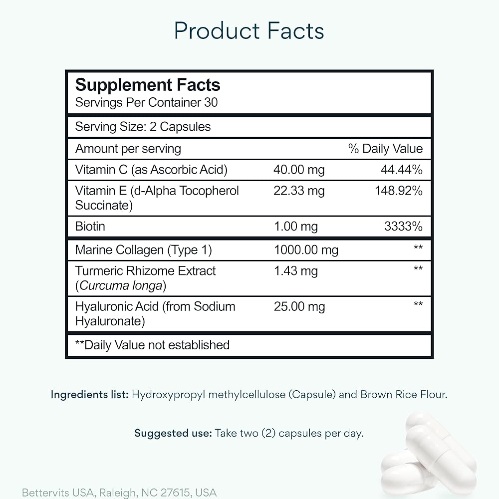 Bettervits Collagen ComplexRejuvenate from within with Bettervits Collagen Peptides Complex, an advanced beauty and wellness supplement for both women and men. Each capsule delivers hydrolyzed marine collagen, vitamin C, hyaluronic acid, and biotin—a synergistic blend that supports skin elasticity, hydration, joint flexibility, and hair and nail strength. As we age, natural collagen production declines, which can affect the look and feel of skin, hair, and joints. Bettervits Collagen Complex helps replenish essential amino acids to maintain firmness, strength, and vitality. The inclusion of vitamin C enhances collagen synthesis, hyaluronic acid helps retain skin moisture, and biotin supports keratin formation for stronger hair and nails. Our formula uses hydrolyzed collagen peptides for optimal absorption and bioavailability. Produced in a GMP-certified facility and third-party tested, Bettervits Collagen Peptides are clean, non-GMO, and designed for those seeking an effective, premium-grade collagen supplement they can trust every day.