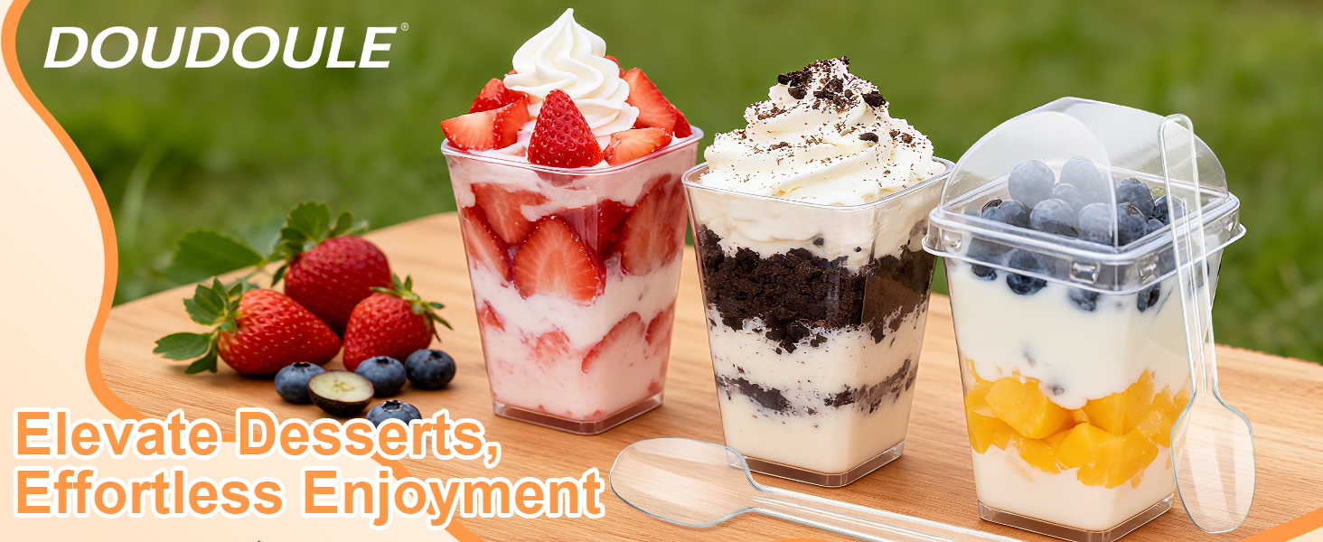 • متعددة الاستخدامات لأي مناسبة: مثالية للحفلات، وحفلات الزفاف، وحفلات استقبال الأطفال، وأعياد الميلاد، وطاولات تقديم الطعام، والنزهات الخارجية، والسفر، والتجمعات العائلية أو مناسبات العمل، فأكواب DOUDOULE للحلوى ذات الأغطية مثالية لعرض البارفيه، والمقبلات، والموس، والبودنج، وسلطات الفاكهة، والآيس كريم، والزبادي، والمعجنات، والكوكتيل أو أي علاج يمكنك تخيله. يمكنك اصطحابها إلى أي مكان دون عناء - مما يجعل التجمعات تتألق، وتتيح لك الاستمتاع بكل لحظة.
