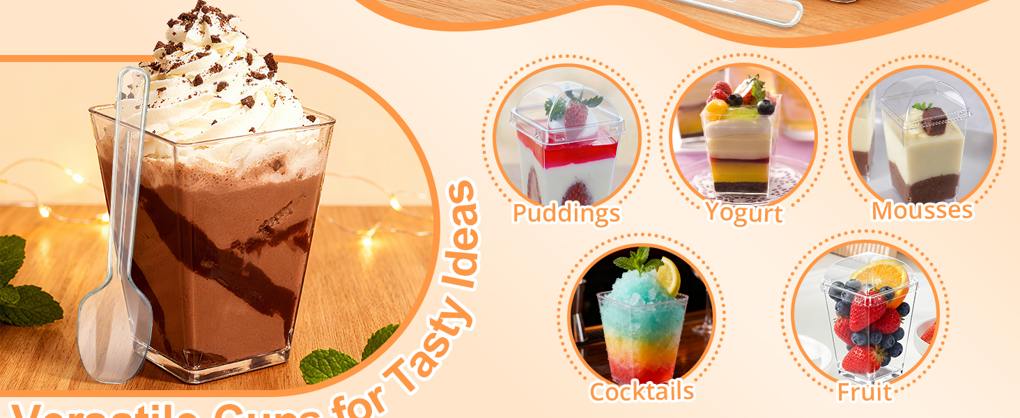 • الحجم المثالي: أكواب الحلوى ذات الأغطية بسعة 5 أونصة هي الحجم المثالي الذي يعرض إبداعاتك بأناقة، بينما توفر الحجم المناسب للوجبات الفردية لإرضاءك دون أن تغلب عليها. بسعة 5 أوقية، قياس 1.6 بوصة في الأسفل، 2.2 بوصة في الأعلى، و3 بوصة طول، مع ملعقة طويلة 4 بوصة، فهي توفر جزءًا مثاليًا وسهولة التعامل في كل مناسبة.