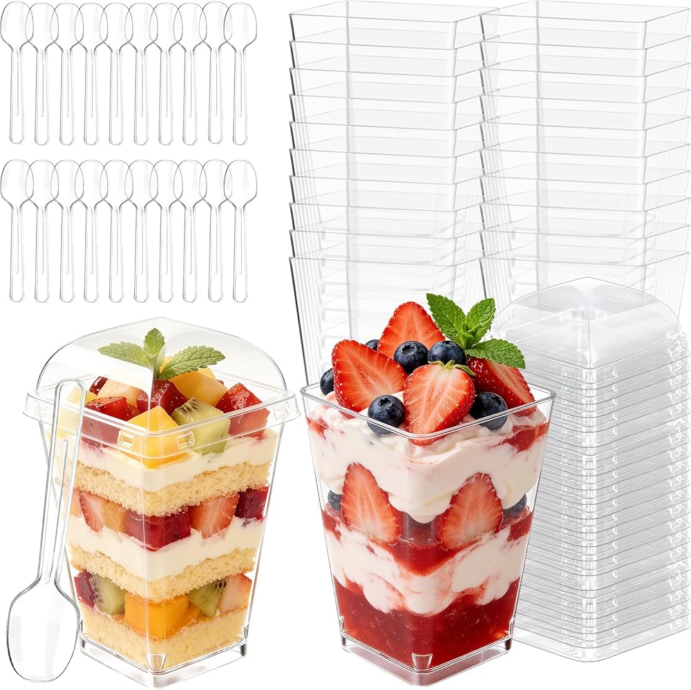أكواب حلوى بلاستيكية مع أغطية وملاعق، أكواب زبادي صغيرة شفافة مع أغطية، أكواب صغيرة للحلوى مع ملاعق، أكواب مربعة للمقبلات للحفلات وبودنغ الفاكهة والآيس كريم 20 عبوة in Kuwait