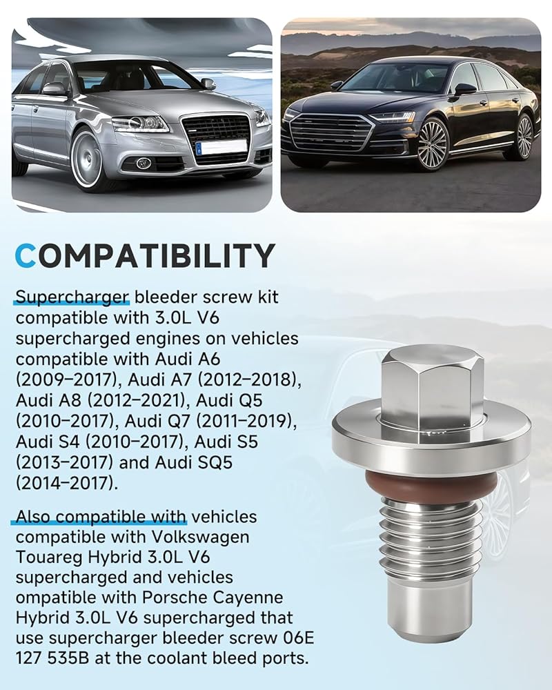 [Compatibility] Supercharger bleeder screw kit compatible with 3.0L V6 supercharged engines on vehicles compatible with Audi A6 (2009–2017), Audi A7 (2012–2018), Audi A8 (2012–2021), Audi Q5 (2010–2017), Audi Q7 (2011–2019), Audi S4 (2010–2017), Audi S5 (2013–2017) and Audi SQ5 (2014–2017). Also compatible with vehicles compatible with Volkswagen Touareg Hybrid 3.0L V6 supercharged and vehicles compatible with Porsche Cayenne Hybrid 3.0L V6 supercharged that use supercharger bleeder screw 06E 127 535B at the coolant bleed ports.