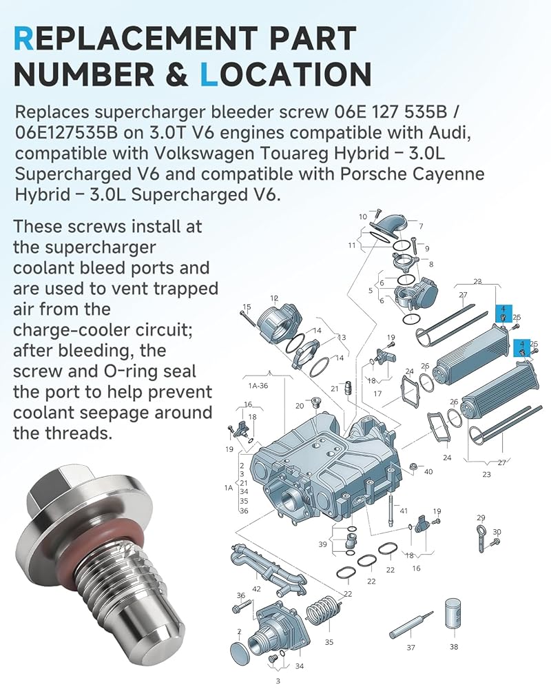 [Replacement Part Number & Location] Replaces supercharger bleeder screw 06E 127 535B / 06E127535B on 3.0T V6 engines compatible with Audi, compatible with Volkswagen Touareg Hybrid – 3.0L Supercharged V6 and compatible with Porsche Cayenne Hybrid – 3.0L Supercharged V6. These screws install at the supercharger coolant bleed ports and are used to vent trapped air from the charge-cooler circuit; after bleeding, the screw and O-ring seal the port to help prevent coolant seepage around the threads.