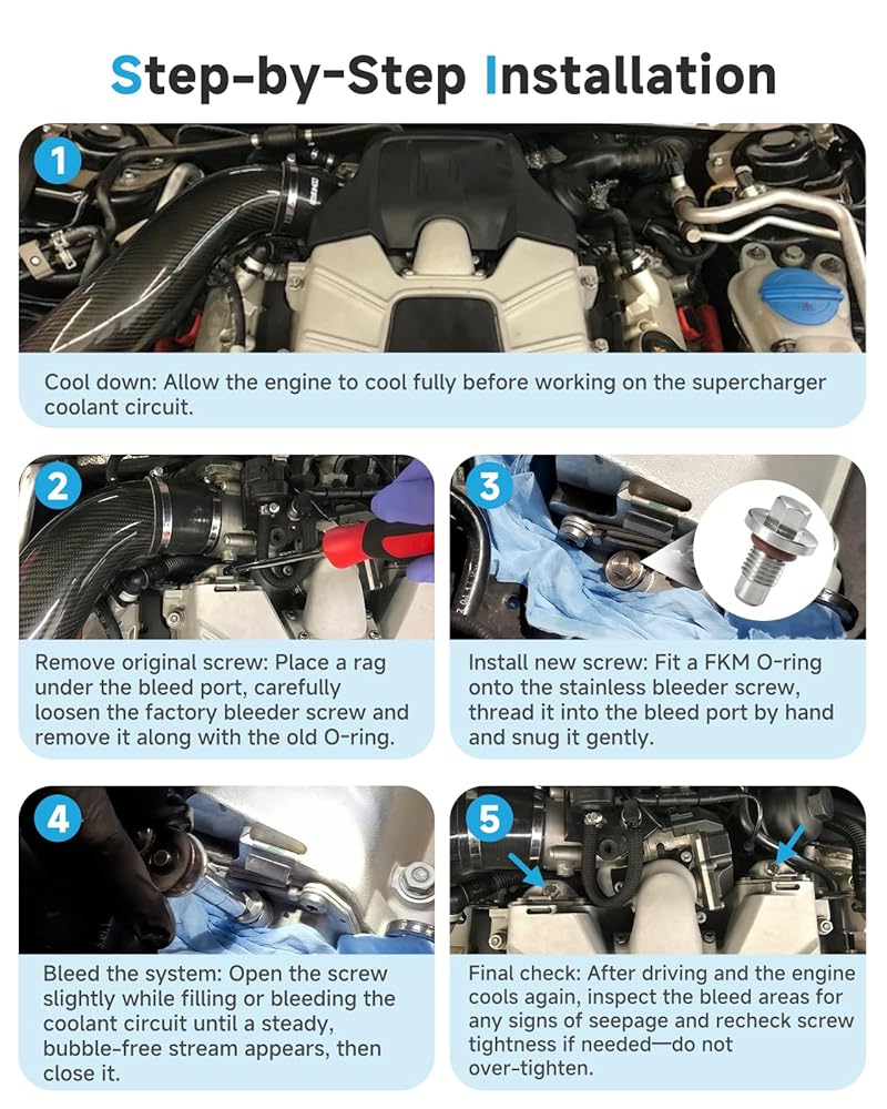 [Usage Scenarios] Intended for vehicles with 3.0L V6 supercharged engines where the original plastic bleeder screws have rounded off, cracked or started to seep coolant at the supercharger bleed ports. Upgrading to stainless screws with FKM O-rings helps provide a more robust bleed point for coolant changes, supercharger cooling system repairs and intercooler upgrades, and is a practical preventative upgrade for owners and shops that service these engines regularly.