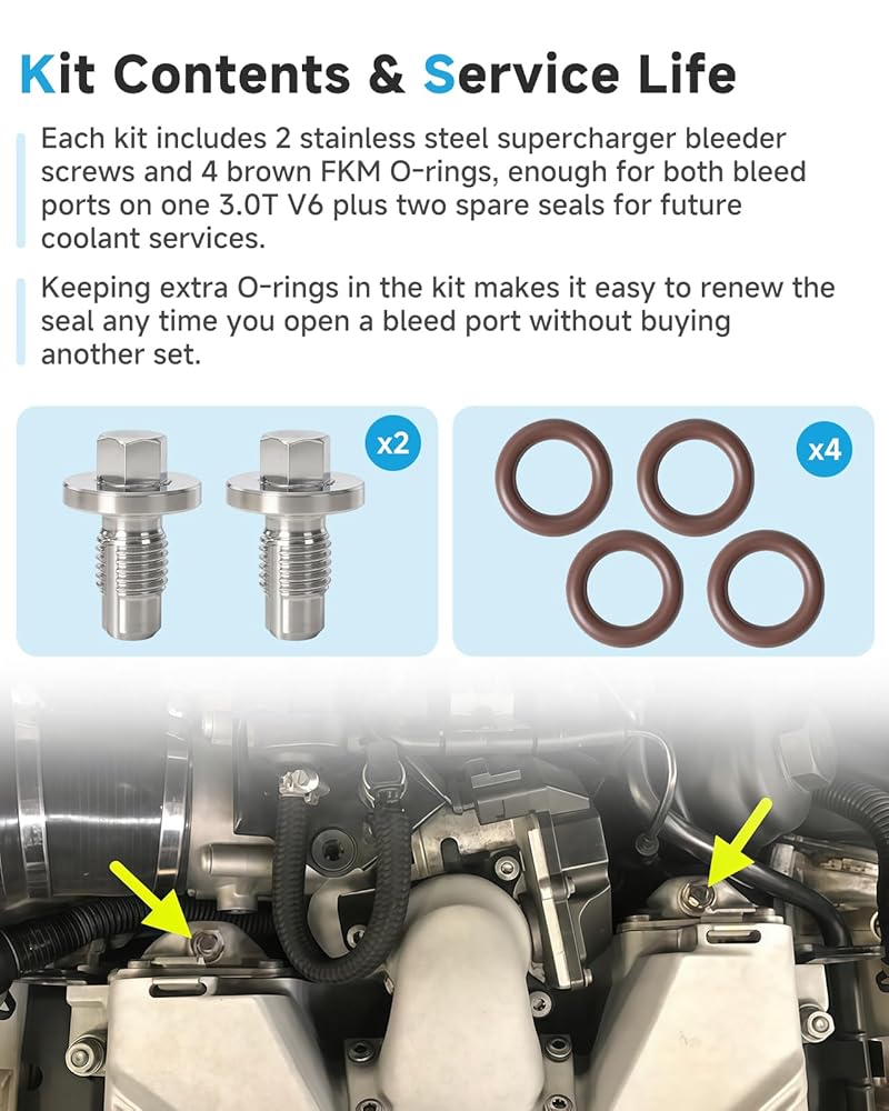 [Kit Contents & Service Life] Each kit includes 2 stainless steel supercharger bleeder screws and 4 brown FKM O-rings, enough for both bleed ports on one 3.0T V6 plus two spare seals for future coolant services. Keeping extra O-rings in the kit makes it easy to renew the seal any time you open a bleed port without buying another set.
