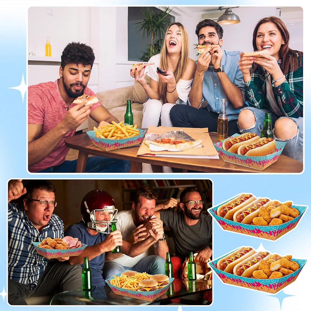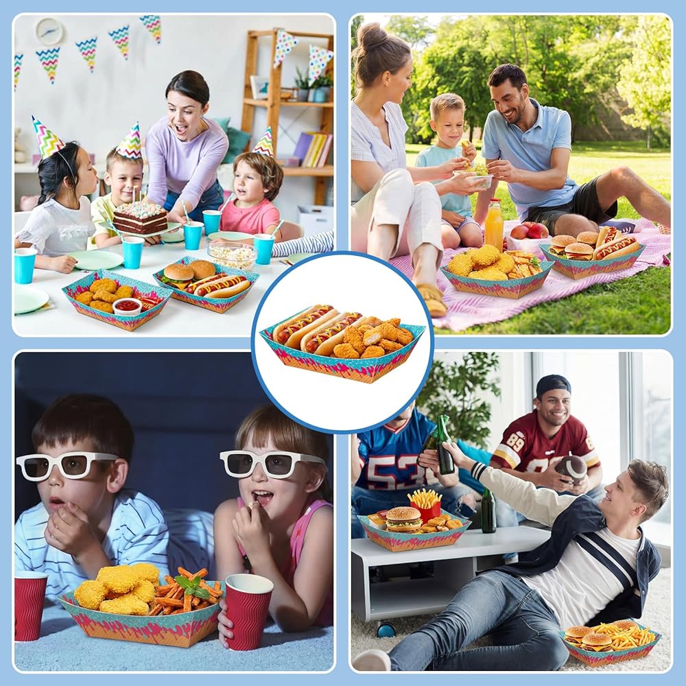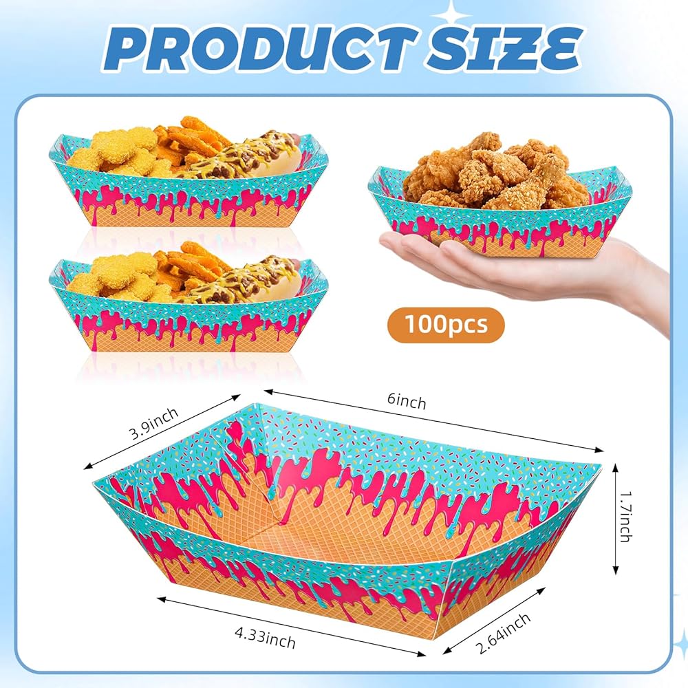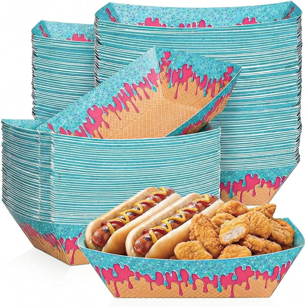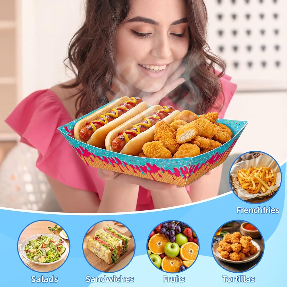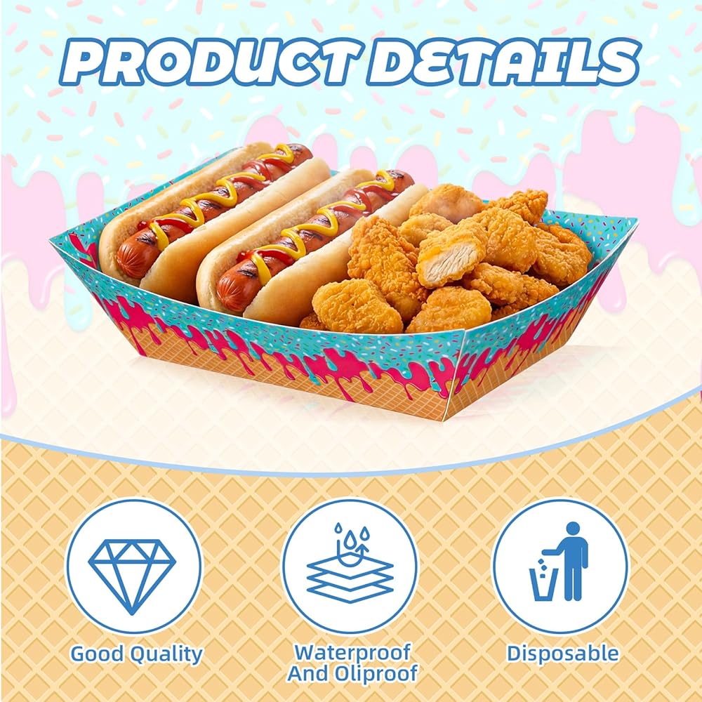 Ice Cream Themed Design: our ice cream themed hot dog tray features classic elements paired with vibrant colors, creating an ice cream atmosphere for your various parties; Placed on the dining table, these disposable ice cream plates can make your party even more exciting; They're not only practical snack containers but also perfect decorations for any party, leaving a lasting impression on your guests