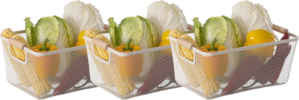 مجموعة أساسية مكونة من 3 سلال شبكية معدنية كبيرة متعددة الأغراض مع منظمات تخزين بمقبض خشبي للمطبخ والحمام وخزانة وحامل الفاكهة وحامل الأطعمة والمشروبات وديكور المنزل in Kuwait