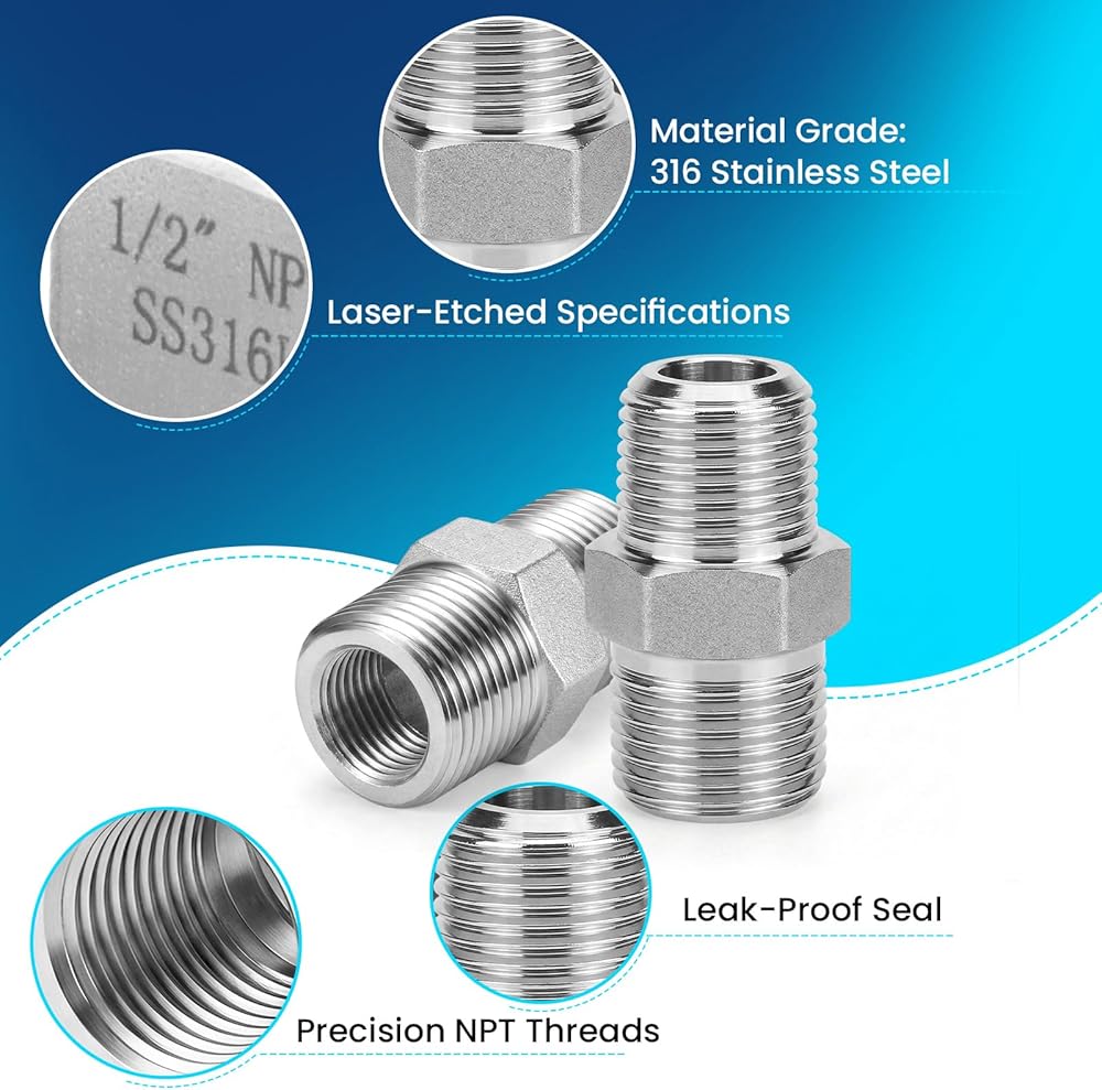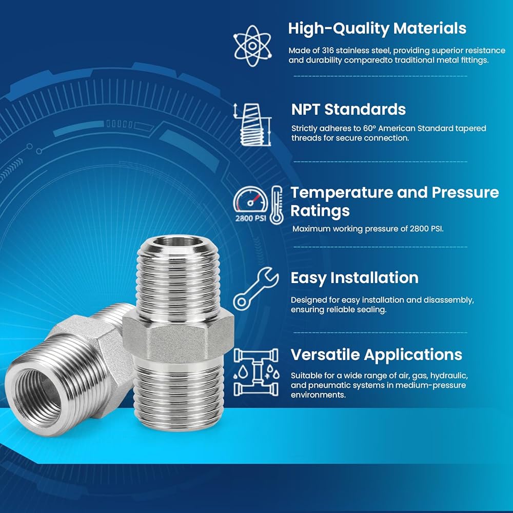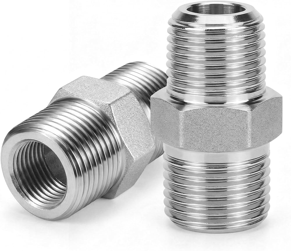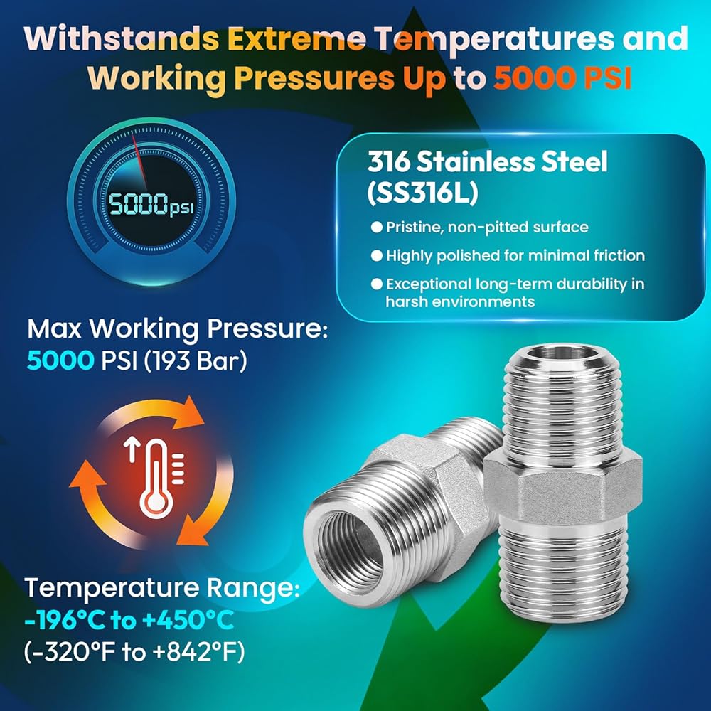 2 قطعة 1/4 "NPT ذكر تركيبات أنابيب الحلمة السداسية - محول ملولب من الفولاذ المقاوم للصدأ 316 من الدرجة الصناعية 5000 رطل لكل بوصة مربعة لضاغط الهواء وتطبيق خط الغاز الهيدروليكي