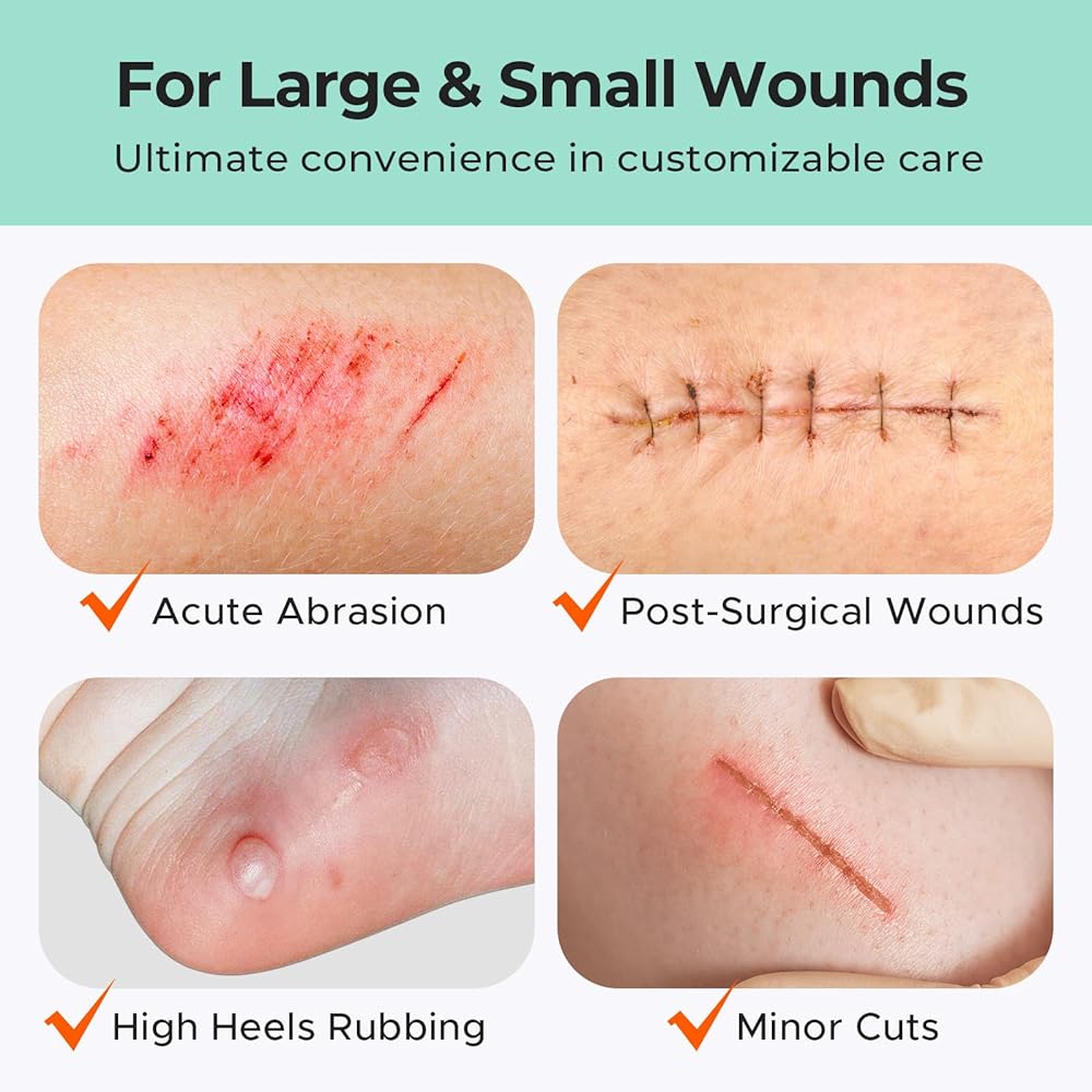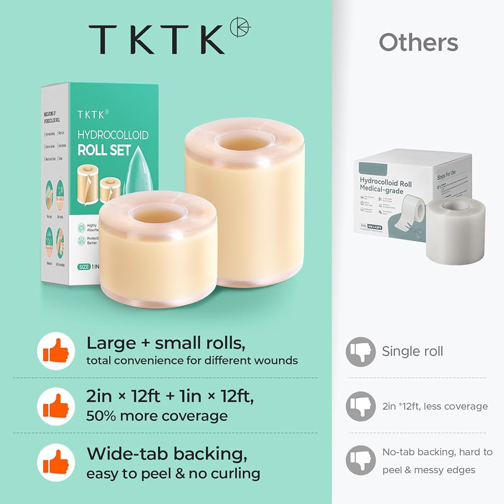 • مقاسان، إجمالي 24 قدمًا لتغطية 2X: باعتبارها أول مجموعة لفافة غروانية مائية من TKTK، فهي تتضمن لفة واحدة كبيرة وأخرى صغيرة للعناية بالجروح وحب الشباب بأحجام مختلفة. إنه مثالي للخدوش والبثور والجروح والحروق وسحجات الكعب والمزيد. الأحجام هي 2 بوصة × 12 قدمًا + 1 بوصة × 12 قدمًا، مما يمنحك المزيد من الخيارات والتغطية