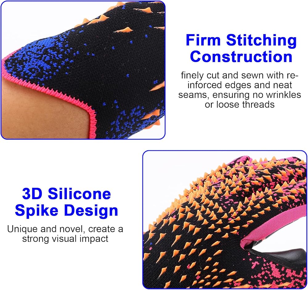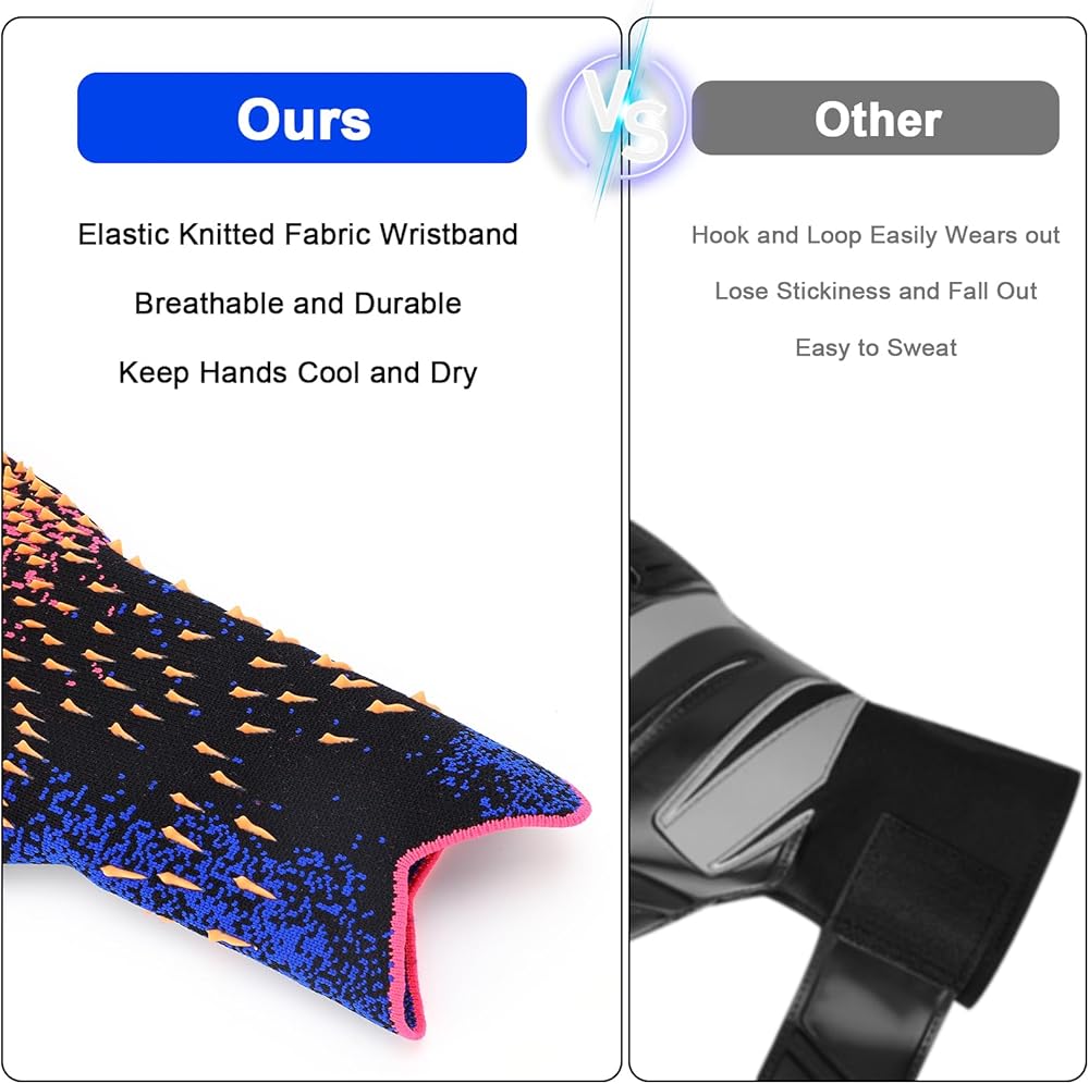 Breathable and Safe Material: These innovative goalkeeper gloves are here to improve your performance and comfort on the field. Made from ultra-breathable knitted fabric and high-performance grip latex, these gloves surpass traditional made from air-tight PVC or EVA materials. They solve the common issues with breathability and grip, all while ensuring your hands remain cool and dry