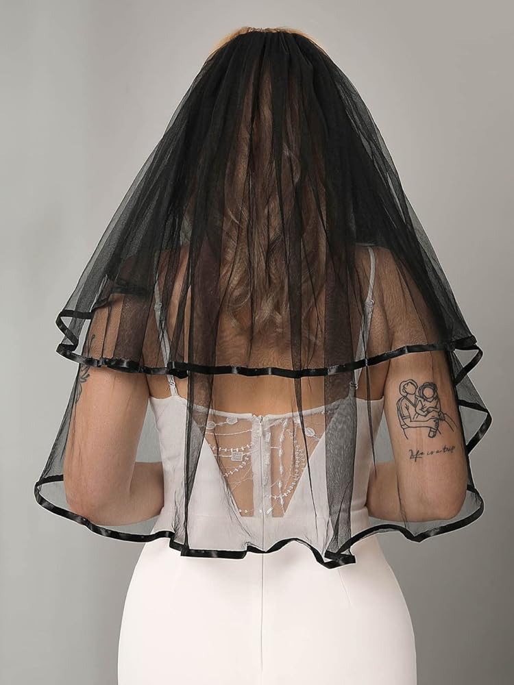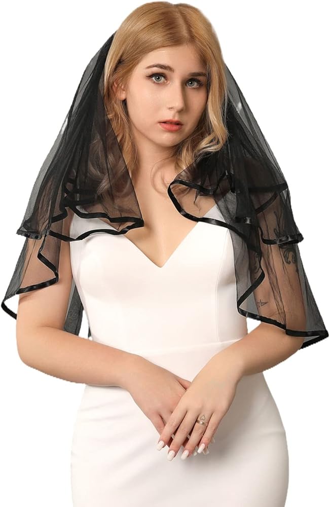 Unsutuo طرحة زفاف سوداء 2 طبقة شريط الهالوين حجاب مخصص حجاب قوطي أحمر الخدود حجاب الكوع حجاب الزفاف مع مشط للنساء والفتيات