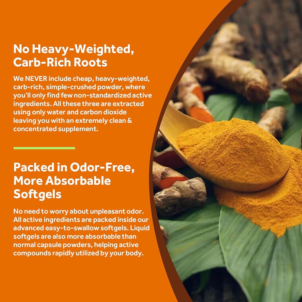 الكركم فائق التركيز: تم استخدام الكركم في تقاليد الأيورفيدا لعدة قرون. خصائصه الطبية تأتي من مكوناته النشطة، الكركمينويدات. تحتوي تركيبتنا الطبيعية على 600 ملغ من مستخلص الكركم لكل وجبة، مما يوفر تركيزًا عاليًا (95%) من الكركمينويدات النشطة، في حين أن تلك المساحيق تمتلك فقط 1-6%. تتم إضافة الفلفل الأسود لزيادة الامتصاص بنسبة 2000% حتى تحصل على جميع الفوائد التي يقدمها الكركمين.*