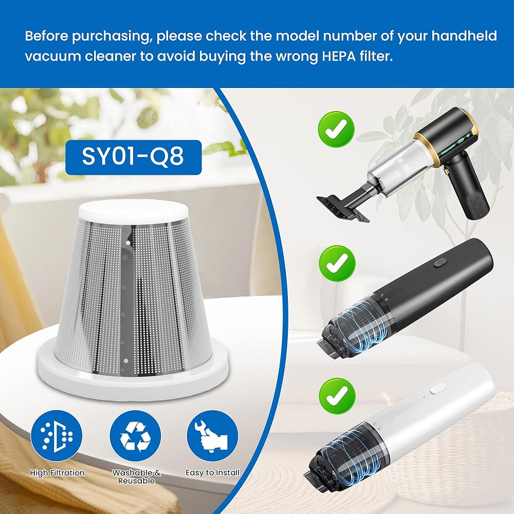 This 5-pack combines 3 standard pleated filters with 2 stainless-steel filters to balance everyday fine-dust capture and durable pre-filtration. Designed to be Compatible with JIXINMIYUE HX-606 & A9life SY01-Q8, the kit helps reduce blowback, manage pet hair and pollen, and maintain suction in handheld or in-car cleaning. Replacement is tool-free—remove the old filter and insert a new one. For best results, rotate and replace every 2–3 months based on use and environment. If rinsed, air-dry completely before reuse. Third-party compatible accessory; model names are used for compatibility reference only.