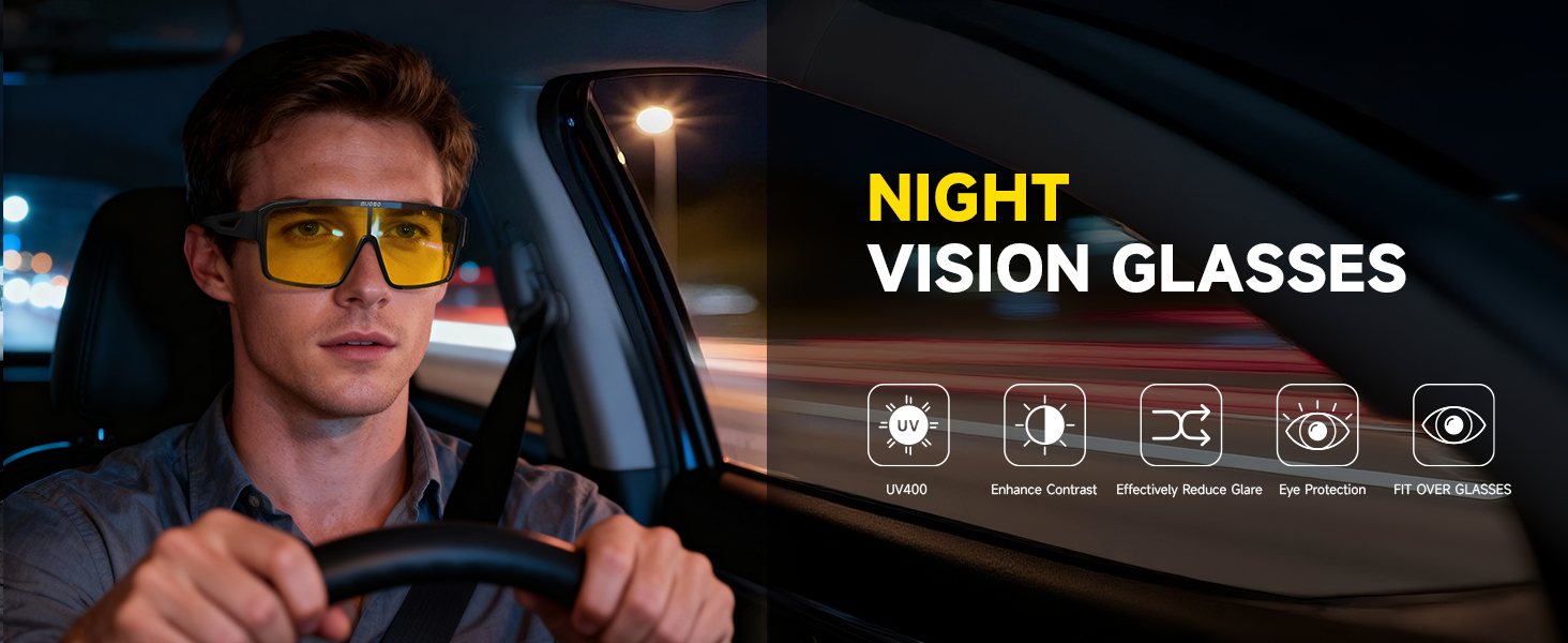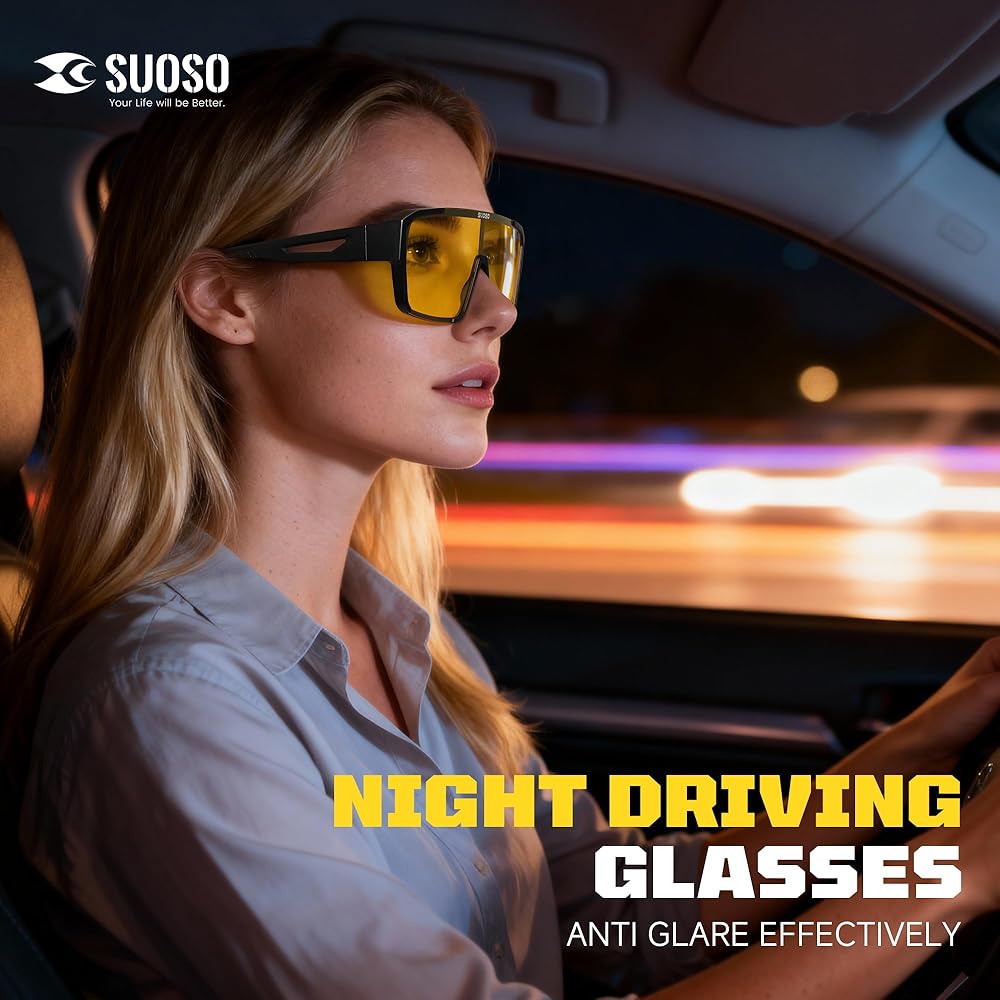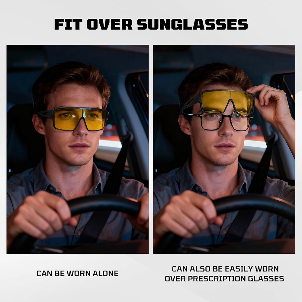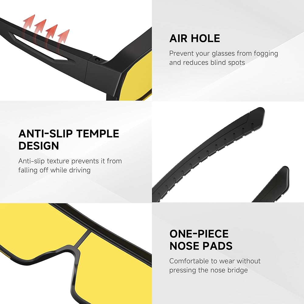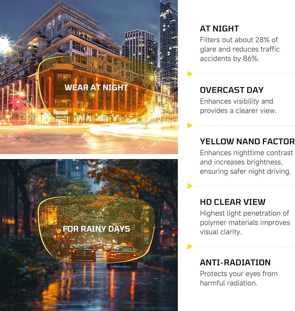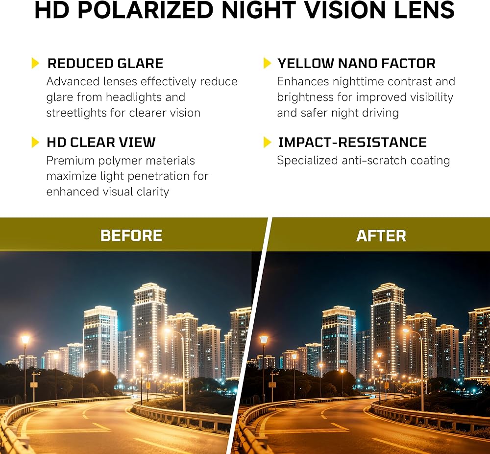 عدسة رؤية ليلية عالية الدقة - عدسات صفراء مستقطبة ممتازة مع طلاء متطور مضاد للانعكاس تقطع الوهج بشكل كبير من المصابيح الأمامية القادمة وأضواء الشوارع القاسية. يعزز الوضوح الليلي، ويحسن التباين، ويقلل من إجهاد العين من أجل قيادة ليلية أكثر أمانًا وراحة.