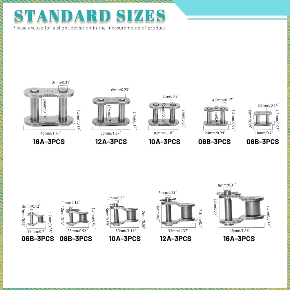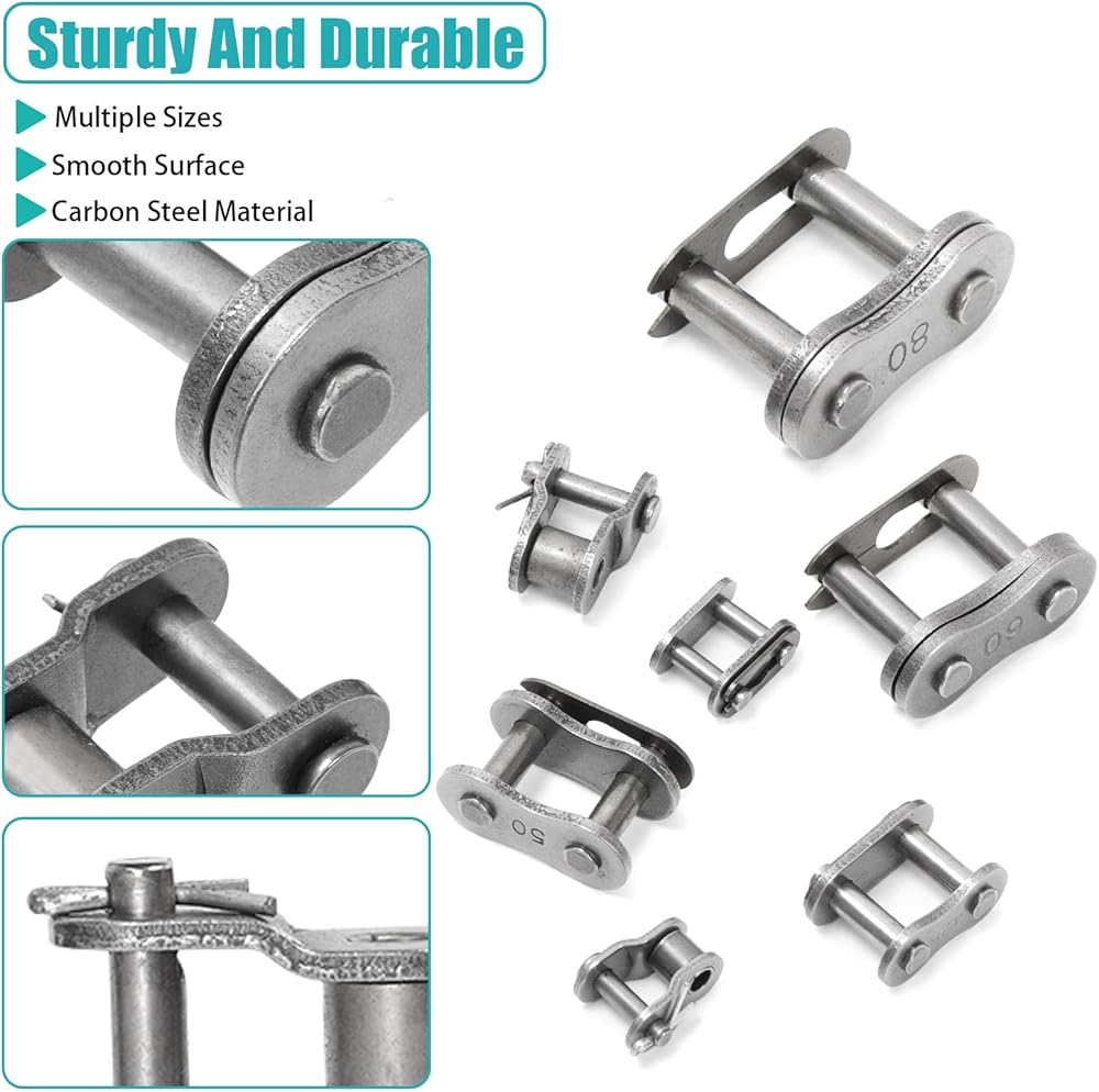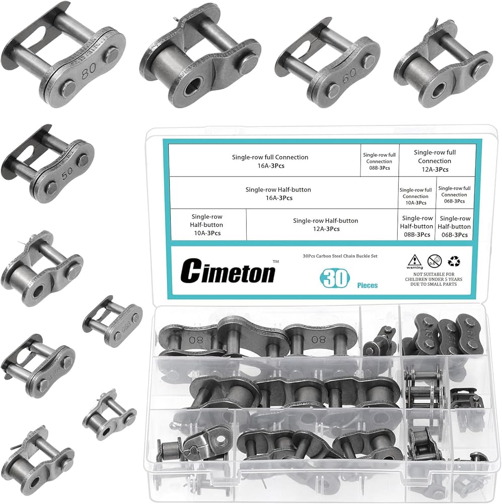 • 🔶【What You Will Get】In this kit, you will get 30pcs roller chain connecting links in 5 different sizes, which are 06B, 08B, 10A, 12A, 16A, per sizes 6pcs. They are packaged in a plastic box for easy storage. Sufficient quantity and rich size can meet your various chain link installation requirements.