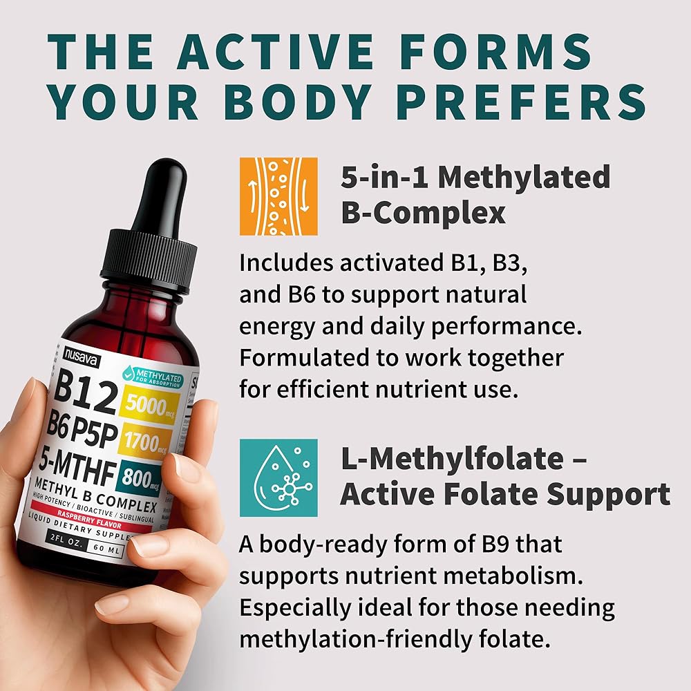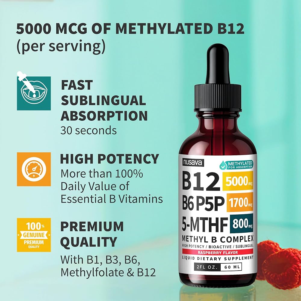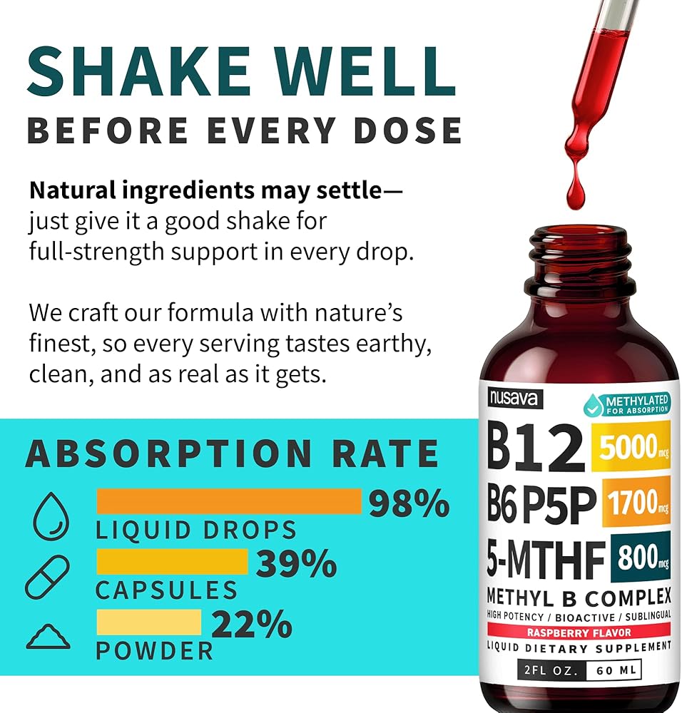 • امتصاص أفضل، جهد أقل: توفر قطرات b12 السائلة فيتامين B12 النشط بيولوجيًا في شكل تحت اللسان سريع الامتصاص - مصمم للعمل مع جسمك حتى تتمكن من الشعور بالدعم دون الانتظار أو متاعب الحبوب.