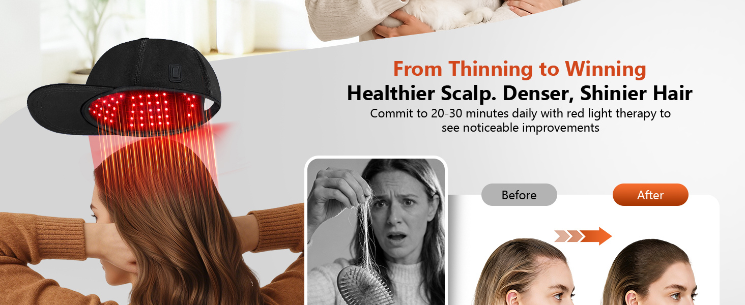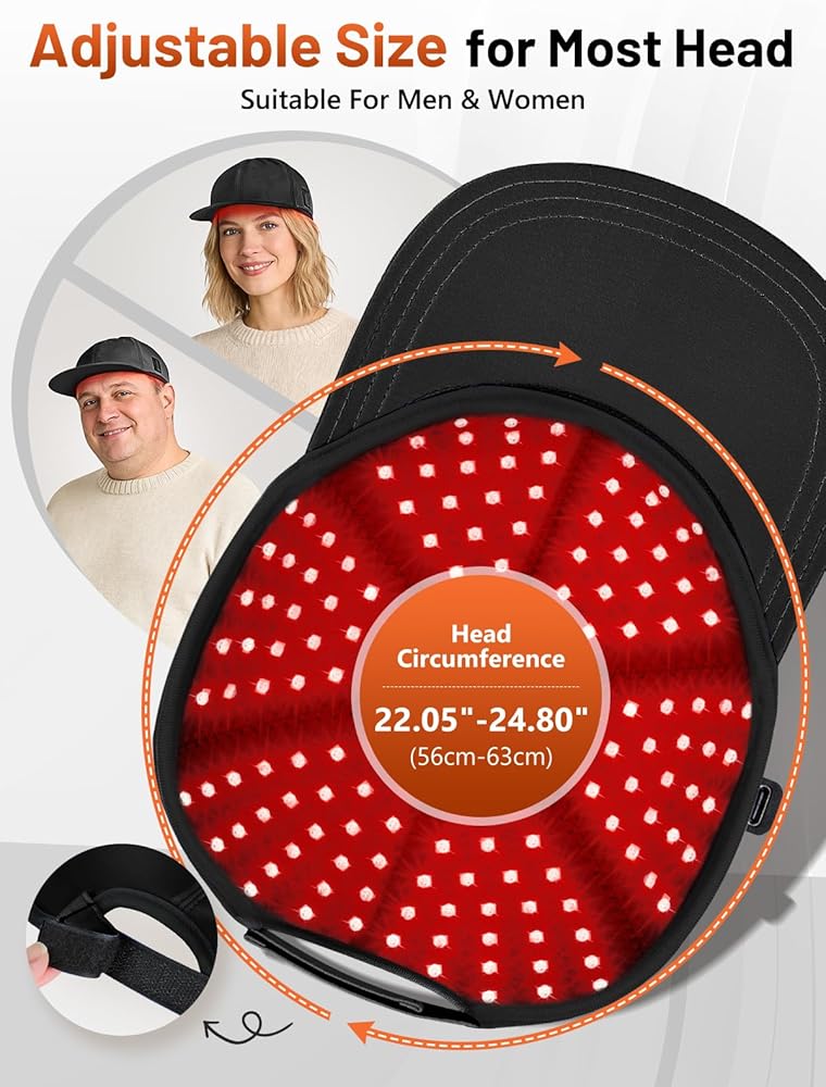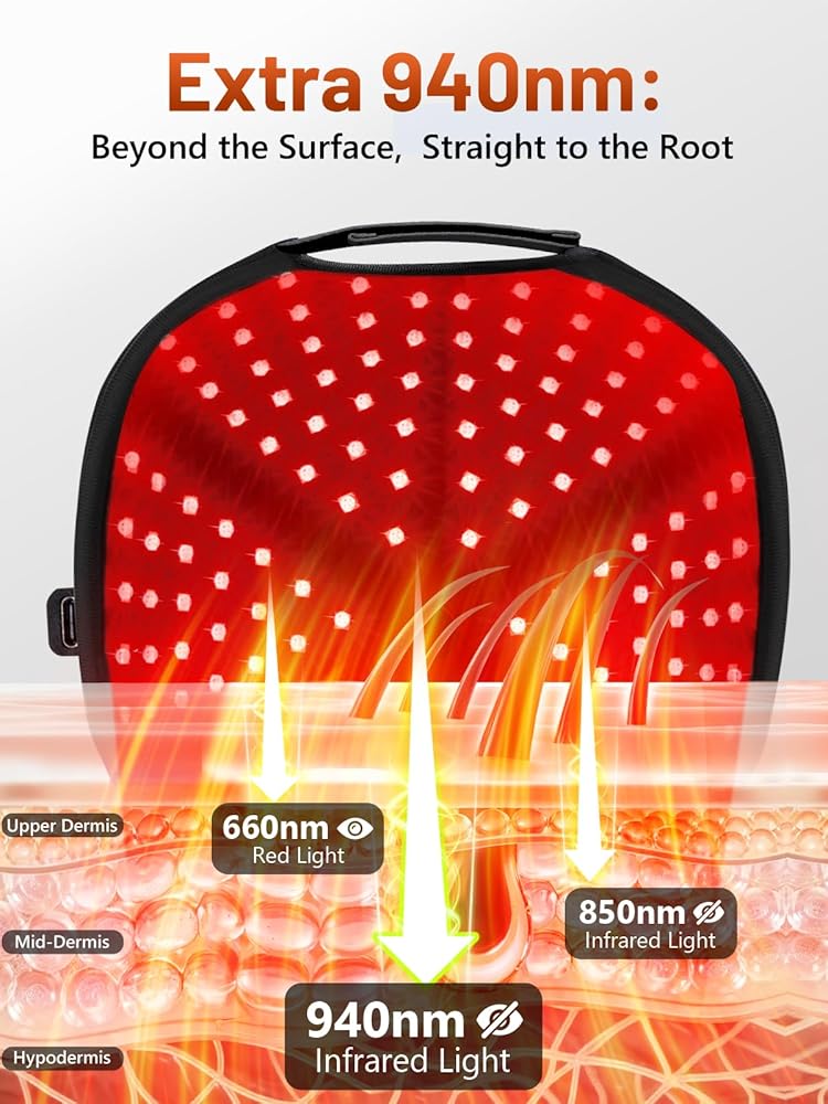 • 【ترقية 940 نانومتر للعناية العميقة بفروة الرأس】بالإضافة إلى الضوء الأحمر المرئي 660 نانومتر والضوء الأحمر غير المرئي 850 نانومتر، تشتمل هذه القبعة على طول موجي 940 نانومتر يهدف إلى استكمال روتين العناية بفروة الرأس.
