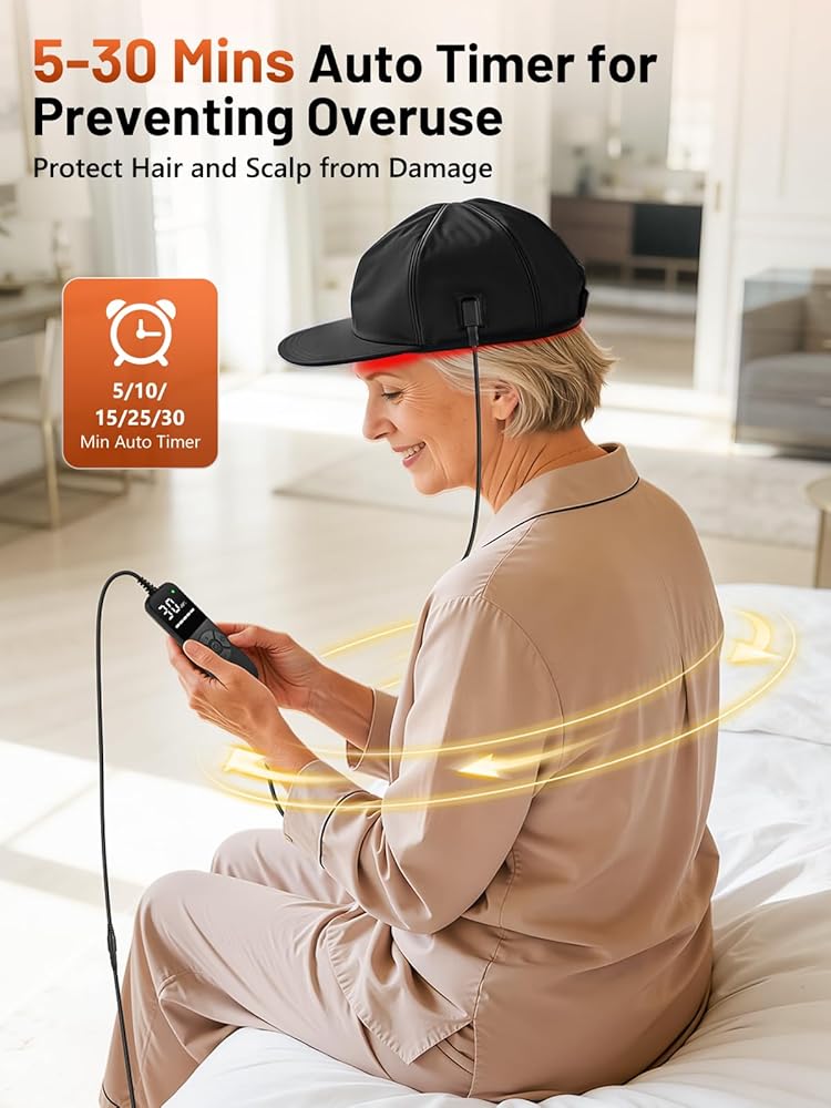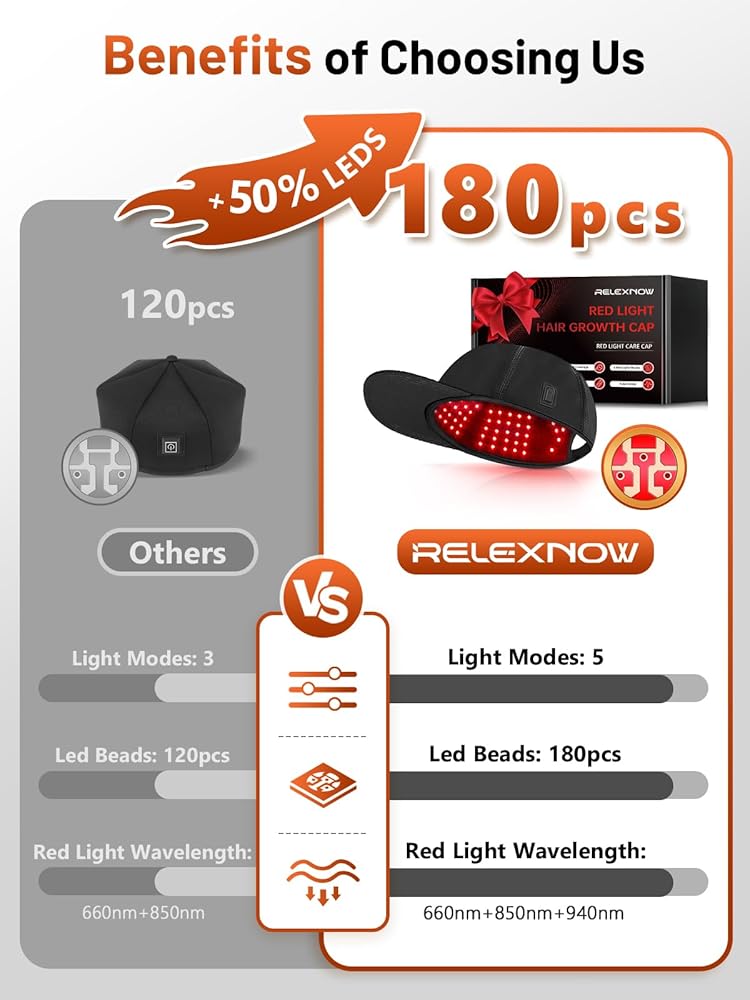 • 【180 خرزة LED لتغطية كاملة】مجهزة بـ 180 خرزة LED عالية الطاقة - أكثر بنسبة 50% من الأغطية القياسية - وهي مصممة لتوفير تغطية واسعة عبر فروة الرأس، ودعم الاستخدام المتسق مع فترات جلسات مريحة.