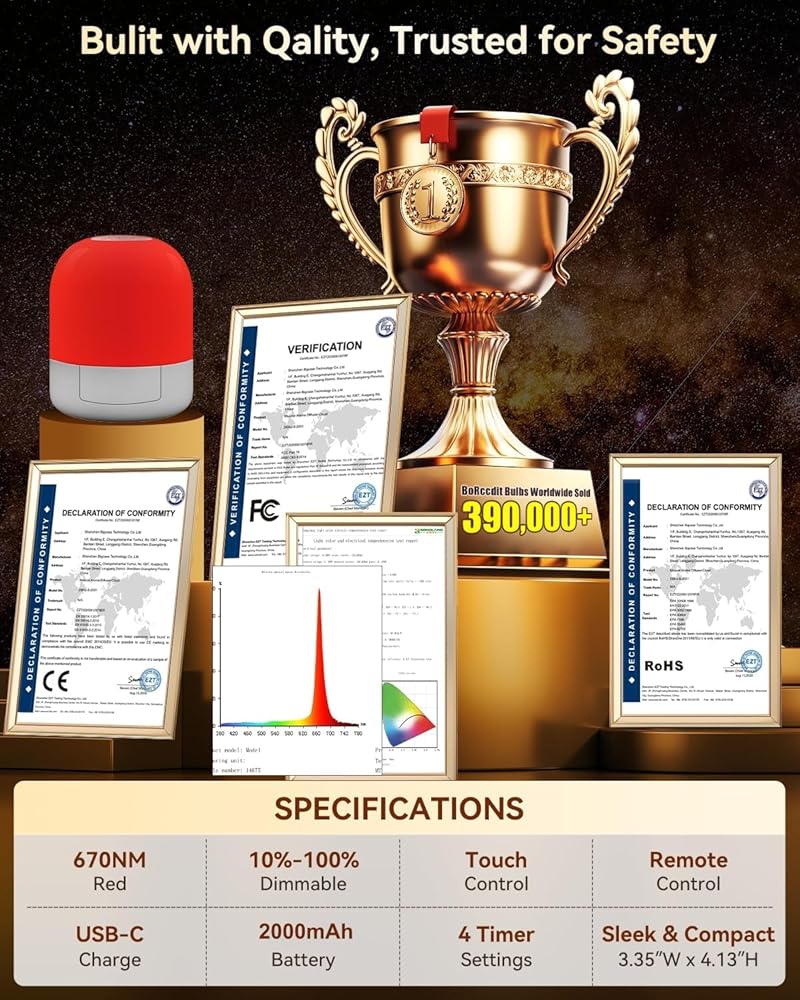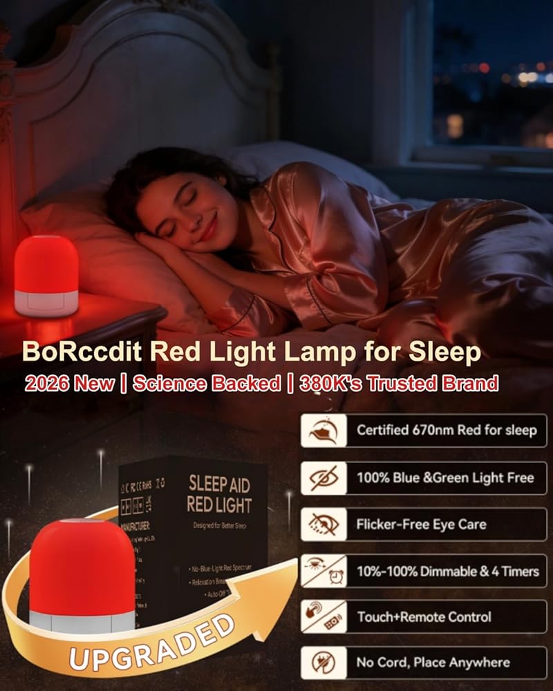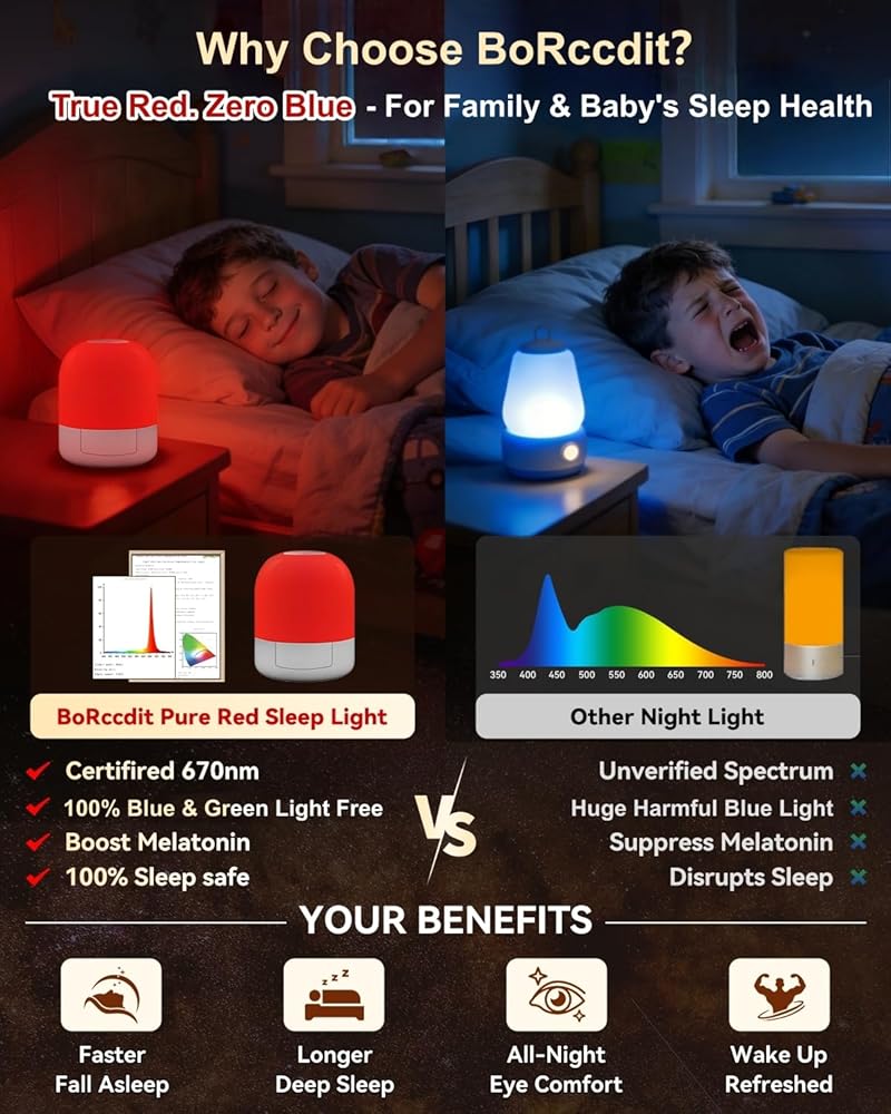 【🏅 ضوء أحمر حقيقي للنوم - ليس مجرد صبغة رخيصة】 على عكس الأضواء "الحمراء" المزيفة التي تستخدم طلاءًا ملونًا، فإن شرائح LED الحمراء النقية 670 نانومتر التي تم التحقق منها معمليًا من BoRccdit توفر أطوال موجية مناسبة للنوم. حجب الضوء الأزرق والأخضر الضار بنسبة 100%. لذلك يعمل الميلاتونين بالطريقة التي أرادتها الطبيعة.
