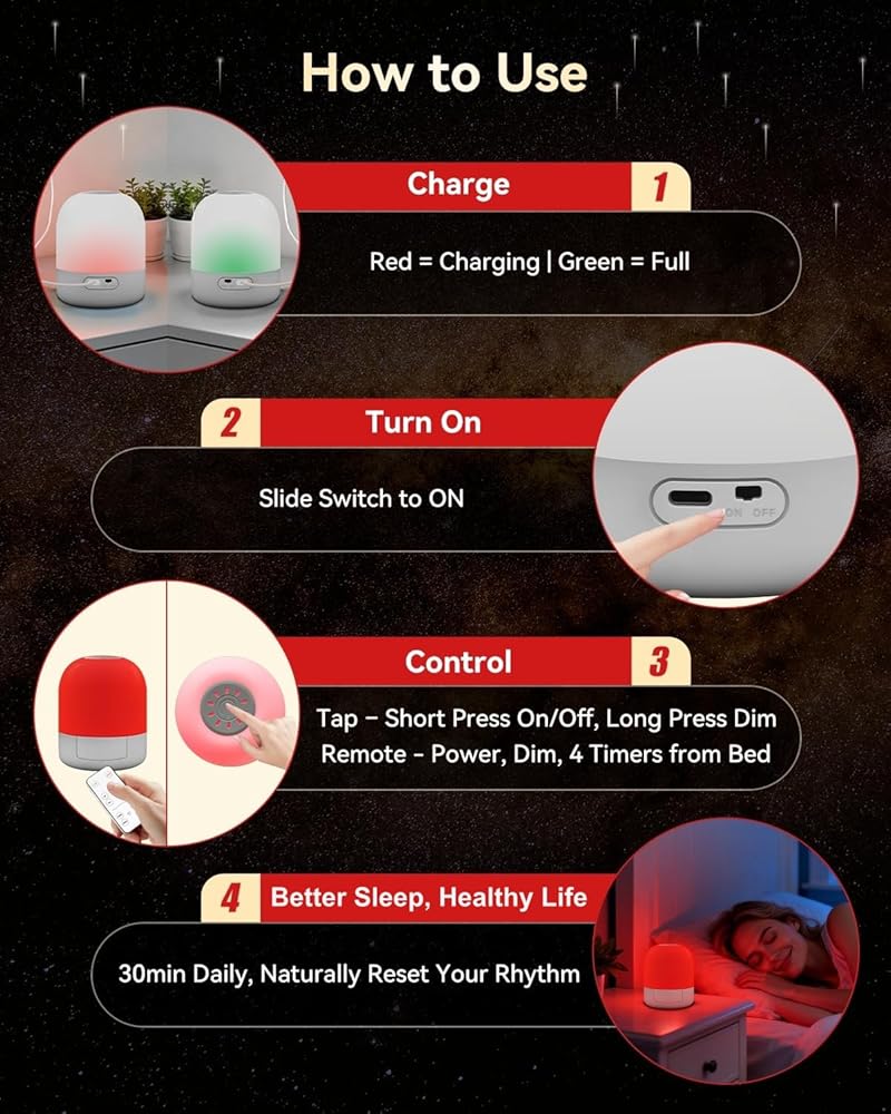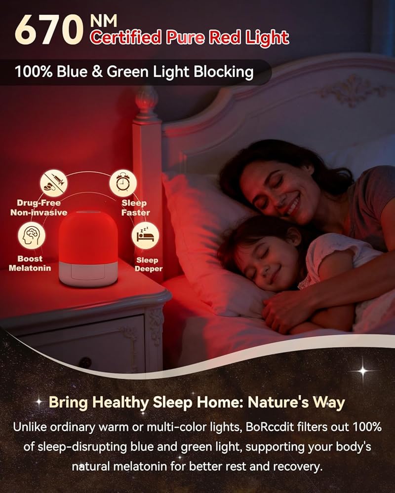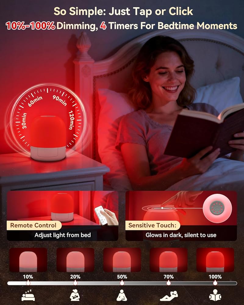 ضوء أحمر من BoRccdit 670 نانومتر للنوم، 100% ضوء أزرق محجوب و10%-100% قابل للتعتيم و4 مؤقتات وجهاز تحكم عن بعد + لمس، مصباح نوم أحمر ليلي طويل الأمد قابل لإعادة الشحن لغرفة النوم والحضانة والقراءة