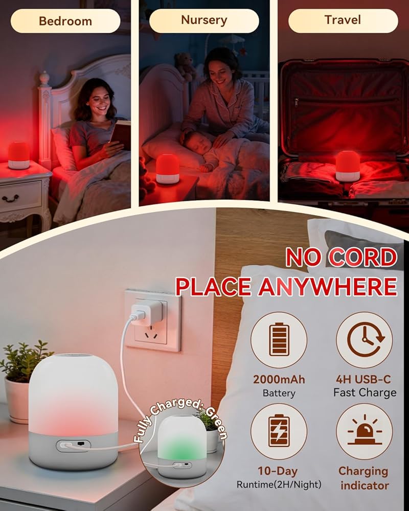 【🔋 بطارية 10 ليالٍ، محمولة في أي مكان】بطارية USB-C قابلة لإعادة الشحن بقدرة 2000 مللي أمبير في الساعة توفر ما يصل إلى 10 ليالٍ من الضوء الأحمر الناعم ليلاً للنوم والاسترخاء (سطوع 10%، ساعتين/ليلة). استخدمه في أي مكان - من غرفة النوم إلى غرفة الأطفال، ومن التخييم إلى السفر - لا يتطلب منفذًا