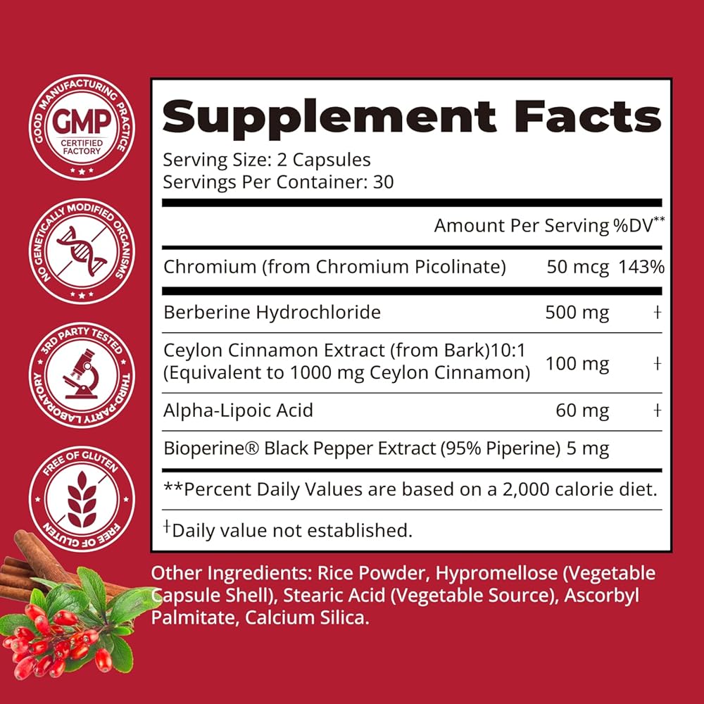 يجمع هذا المركب بين 1600 ملجم من البربارين، وقرفة سيلان الحقيقية، والكروم، وحمض ألفا ليبويك، ومستخلص الفلفل الأسود الفاخر. يتم مزج المكونات بعناية للعمل بشكل تآزري، مما يعزز الفعالية الشاملة ويقدم الدعم الصحي الأمثل.