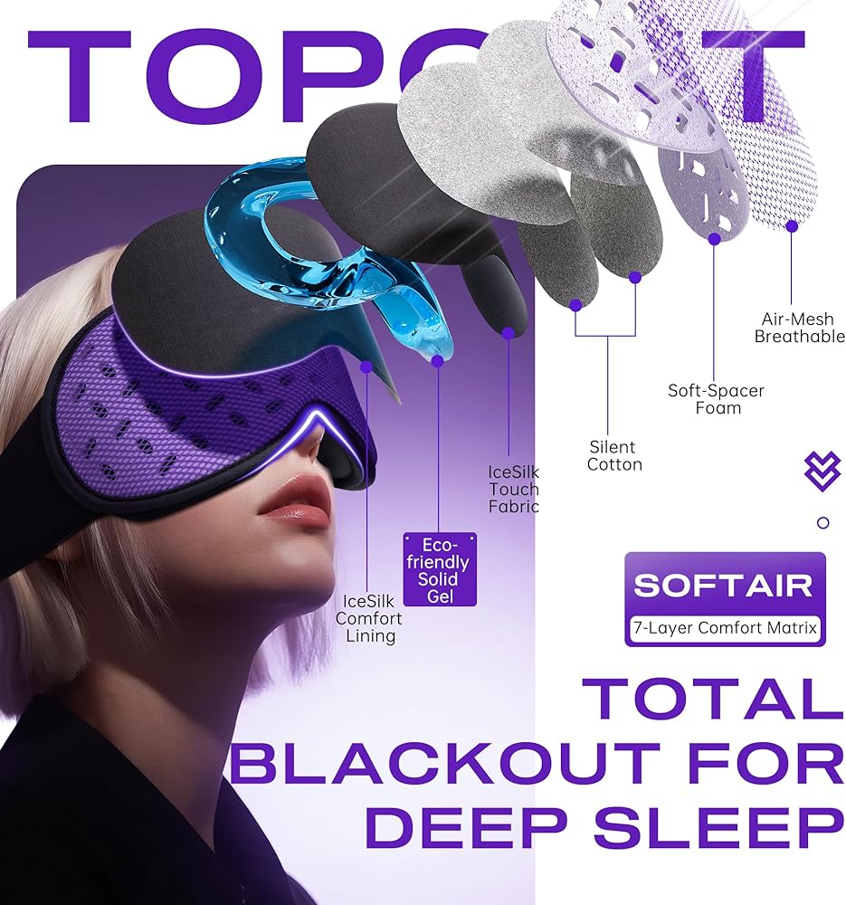 حجب الضوء بشكل نهائي باستخدام تقنية SoftAir المكونة من 7 طبقات: مصمم بـ 7 طبقات من الأقمشة المريحة - شبكة هوائية قابلة للتنفس، إسفنجة فاصلة ناعمة، قطن صامت × 2، لمسة IceSilk، جل صلب صديق للبيئة، وبطانة مريحة من IceSilk - يوفر قناع النوم بتقنية البلوتوث ثلاثي الأبعاد من TOPOINT تعتيمًا كاملاً مع الحفاظ على مساميته وصديق للبشرة.