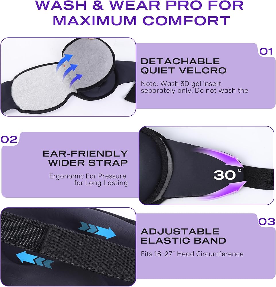تفاصيل مريحة مدروسة: مصممة بفتحة فيلكرو صامتة، ويمكن إزالة أكواب الجل ثلاثية الأبعاد بشكل منفصل لسهولة التنظيف، ويضمن حزام الرأس القابل للتعديل ملاءمة آمنة، كما يساعد تصميم الأذن بزاوية 30 درجة على تخفيف ضغط الأذن لتوفير الراحة طوال الليل.