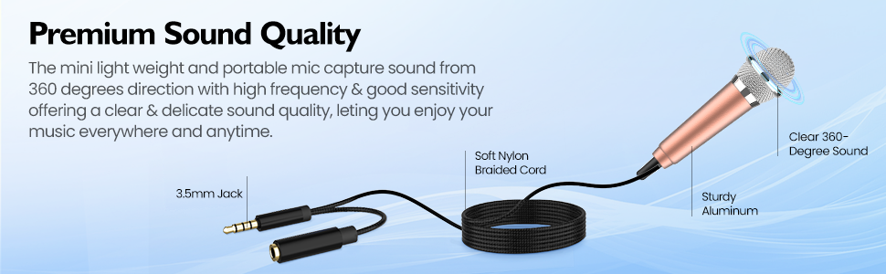 ميكروفون صغير متين ومتميز: مصنوع من سبائك الألومنيوم القوية مع سلك مضفر من النايلون الناعم وسلك خالٍ من التشابك بطول 145 سم. يتميز برأس ميكروفون معدني وغطاء بلوري للحصول على صوت ممتاز ولمسة نهائية أنيقة. الميكروفون الصغير محمول ومثالي للتسجيل أثناء التنقل.